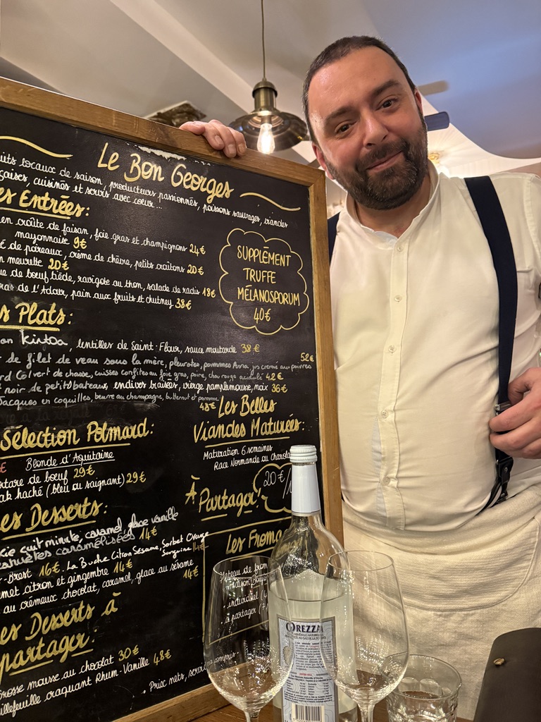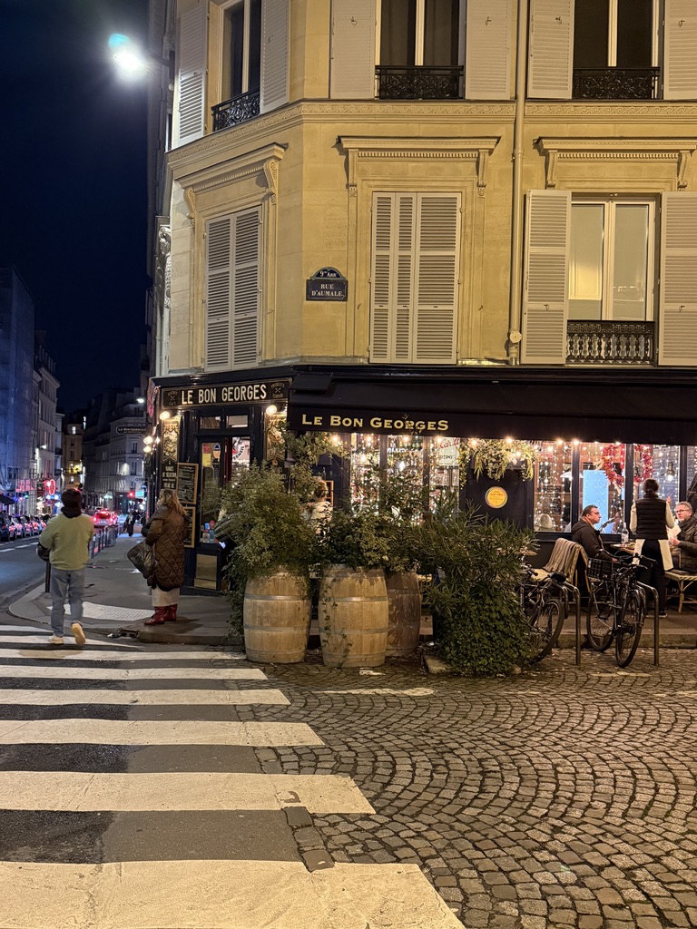 The sun broke through the clouds at about 3 :00 and everything seemed to brighten, as people emerged on the streets and later Christmas lights seemed to appear everywhere. We walked to a little bistro-like restuarant called Le Bon Georges, a few blocks from our hotel, for our 10 :00 pm reservation (When in Paris, eat when the Parisiennes eat !) Turned out to be a wonderful restaurant with a lot of locals and a very friendly and accommodating staff. Reading menus in another language is always challenging as they have all these descriptive words that are hard to figure out.