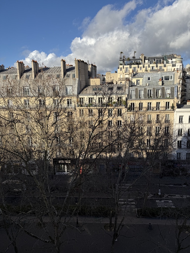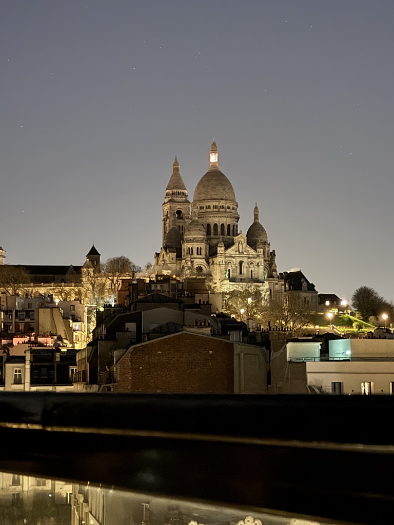 We arrived on a very grey, drizzly December afternoon. Haviing been to Paris many times, we opted to stay in the 9th arrondissement in Montmartre—an area we have never explored in depth. We’ll stay in Montmartre for four nights and then shift to the Saint Germain area where we have stayed numerous times. Anyway, we are at Hotel Rochechouart which looked better on the website than in person, but i twill be fine and is well located within the heart of the neighborhood. The building is from the 1920s and has a lovely Art Deco facade and an amazing rooftop (which in summer has a pretty buzzing bar) with views of both Sacre Couer and the Eifel Tower in the distance. Staff seems friendly and helpful, although when I asked if we could get BBC or any English news programs on the TV, the woman at the desk said «Perhaps this is a good time to practice your French ! » My French is at about the first grade level, having taken it in high school for just one year. So, perhaps in a good way, we will not be exposed to any news (other than on the phone) for a few days. Mostly, the problem with the hotel is that the rooms are painted in fairly dark colors and they are a bit dreary. Then again, we have a little terrace with good views. Tomorrow we will explore Montmartre as we « hike » to Sacre Couer through the winding streets of the neighborhood.