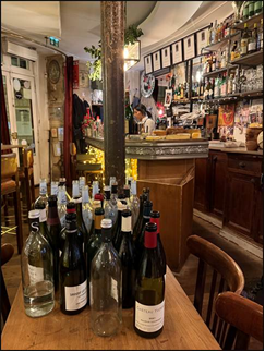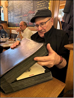 By the waym the photos inclulde Mike looking at the wine « list » which is a giant book ; the view fromn our terrace, Le Bon Georges from the outside and inside, and Sacre Couer from the rooftop of our hotel at about midnight.