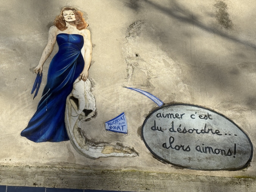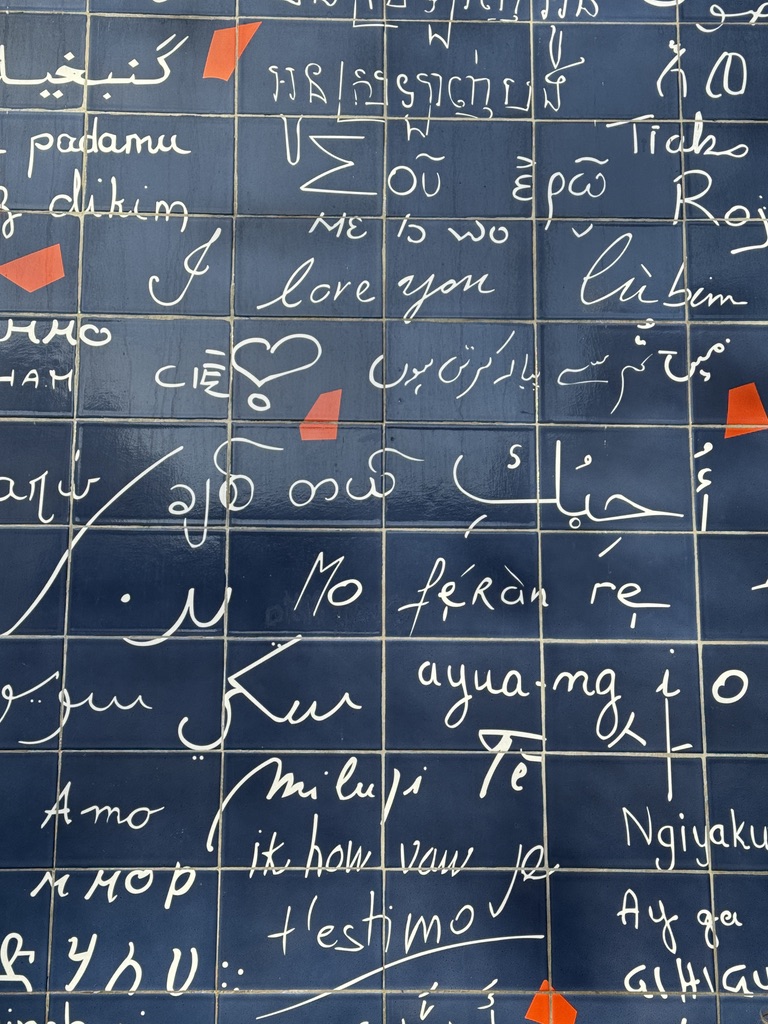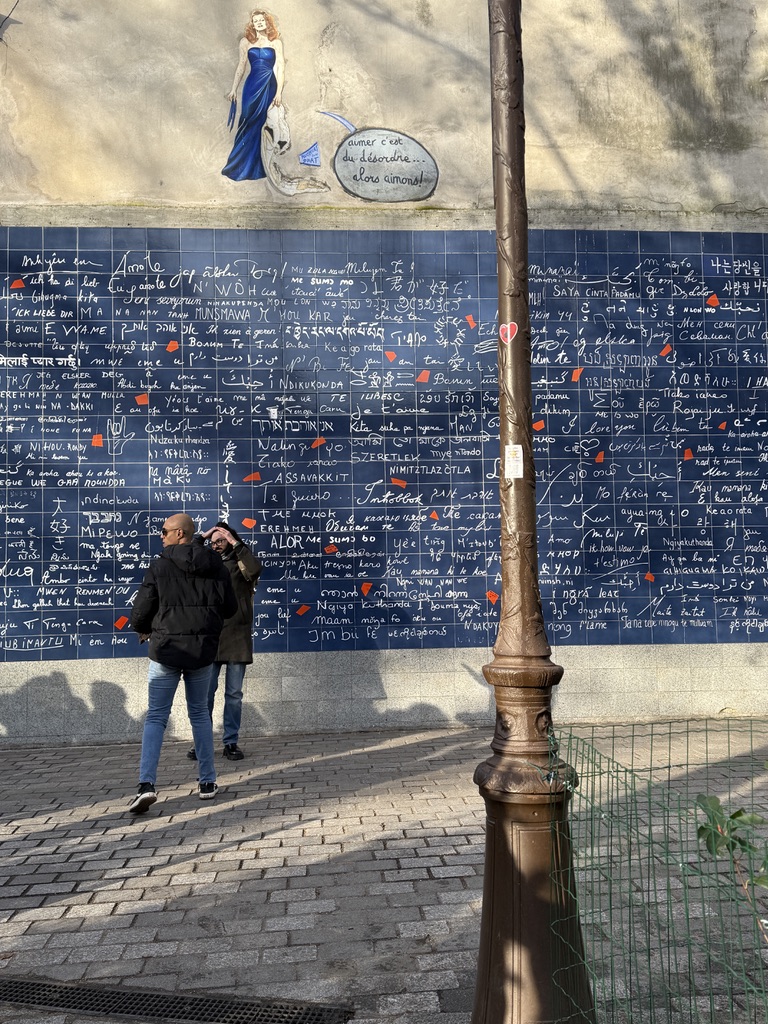 We took a very circuitous route to get to Sacre Coeur – meandering through narrow alleys and cobblestone streets that are classic Montmartre. We stopped at one of the many Christmas markets, went to see several “passages,” and followed some of the street art that adorns many streets in the area. One big attraction seems to be a giant installation that covers one side of a large building. It’s systematically represents every written/spoken language using many different fonts and handwritten phrases—all of which translate to “I love you.” Being the “city of love” I suppose this is a logical statement. The place is filled with people taking selfies and photos with partners. We skipped the photo op but I did take lots of pictures of others taking pictures of themselves and their sweeties. A bit too schmaltzy for me… but I loved how much attention it got.
