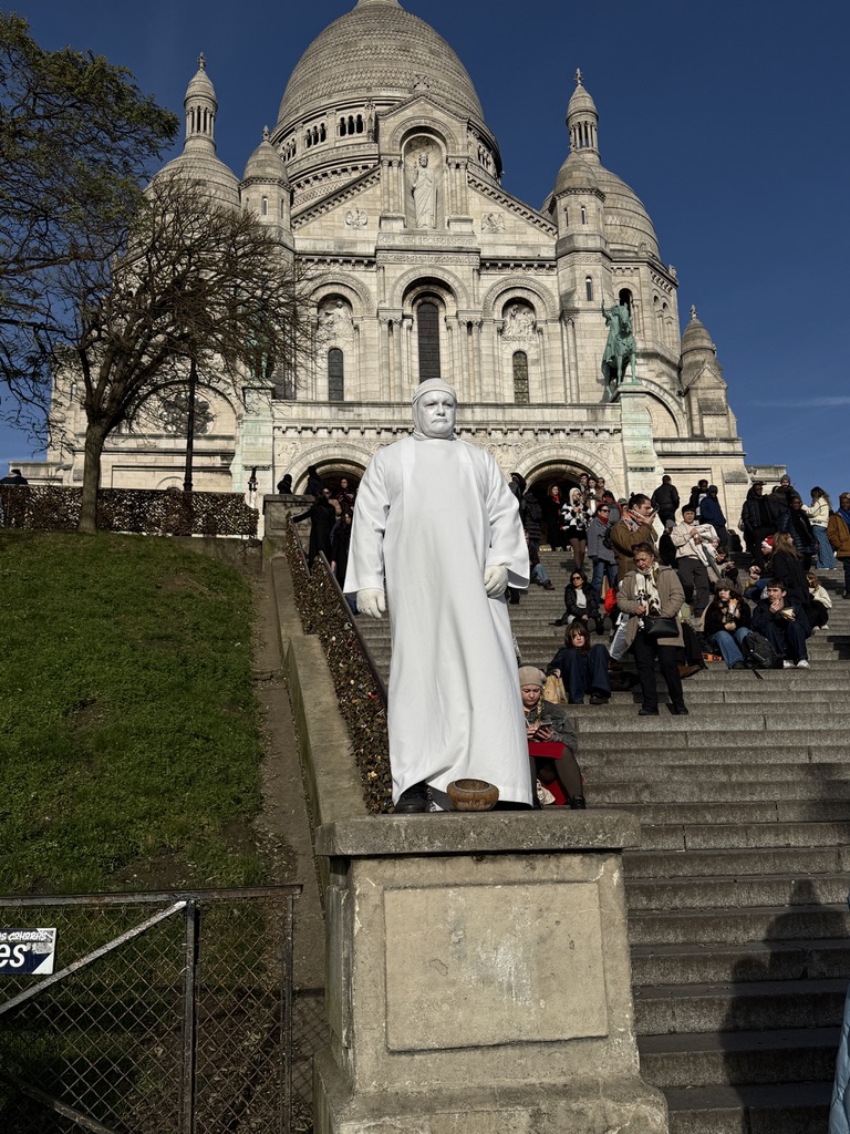 We headed to Sacre Coeur, the focal point of Montmartre—a basilica (don’t ask me what the differences are between a cathedral and a basilica and a church) located at the top of the hilly Montmartre neighborhood in the 9th ar. From the dome, which is about 200 meters above the Seine, the basilica overlooks the entire city of Paris and its suburbs. It’s a big attraction and the lines are often very long to get inside. Approaching the basilica is a bit like a circus with various mimes and hawkers selling everything from miniature basilicas to Eiffel Tower key chains, and then there are the singers and performers and those selling crepes on the street. In any case the interior is quite striking (although for me a bit too overrun with commercial signs “advertising” all sorts of events related to the church.