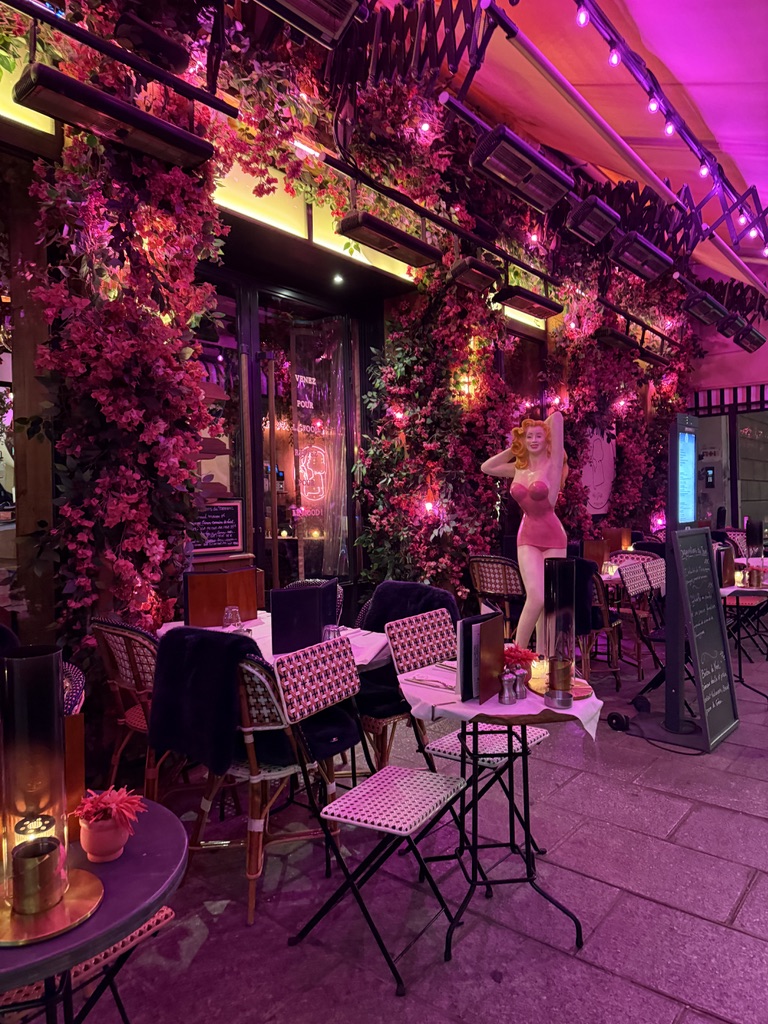 Once we finished packing, we took a taxi from Montmartre to Saint Germain. It took nearly 45 minutes to go less than four miles in the taxi. Traffic is really a mess in Paris. Add to that the Christmas shoppers and window shoppers as well as tourists and bicycles and you’ve got solid gridlock—everywhere. But the metro is pretty packed also. We would have had to deal with suitcases on busy trains, so we taxied. We had a long list of things we wanted to do today, but then Mike was feeling under the weather—hopefully just a cold brought on by walking in the rain all day yesterday. We’ll see how he does tonight. That said, we may pick up a Covid test tonight… just to make triply sure. (But I’m pretty sure it’s a cold)… So Mike stayed in the hotel room and I ventured out. Good thing we changed hotels (which was always part of the plan). Hotel Le Relais—Saint Germain is small but tasteful (albeit a little inconsistent in the décor. Our room is large with lots of extra space to maneuver. We have a full-size couch, as well as a circular glass-top table (which is what I am using to write to you at this moment). It’s a far cry from the cramped, dark room we had at the Montmartre hotel. And we have a really big bathroom.
