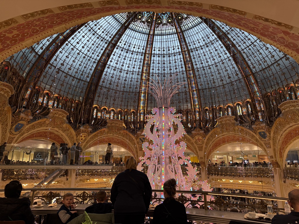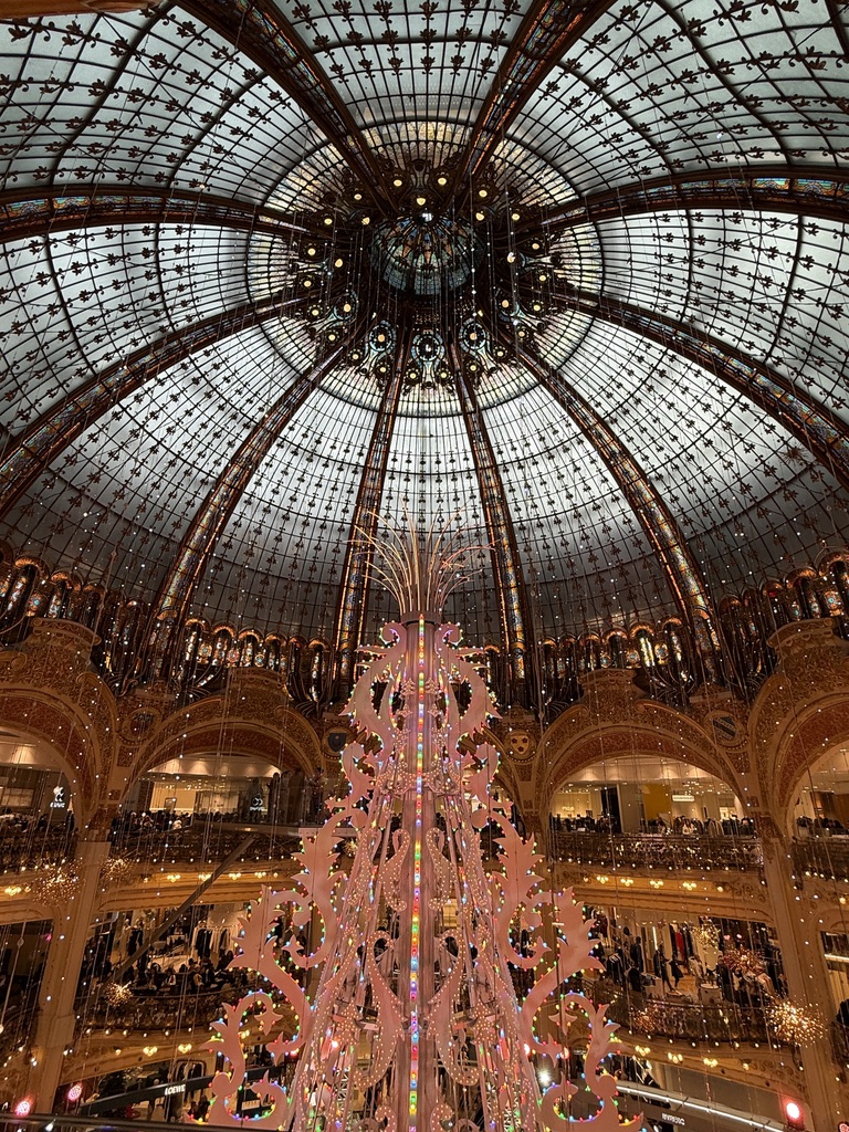 So, while Mike went to sleep, I headed by Metro to see the famous Christmas decorations at Galeries Lafayette (and to finish last minute gift shopping). The decorations did not disappoint. Galeries Lafayette is all decked out with a huge tree-like form designed in the style of a chandelier. I am told it has 20,000 programmable lights and a fiber-optic lighting effect at the top. I managed to squeeze in with the hordes of people entering the store and see the “tree” from both the main floor and the better views from the third floor. I totally got lost on the 5th floor as I tried to get the missing gifts. Galeries Lafayette is 750,000 sq feet (main store) and there are some additional stores for housewares, etc. adjacent. The store is 130-years-old and for nearly as many years it has been creating a hub of excitement with its Xmas themes. But the real highlight of the store is the neo-Byzantine stained-glass dome which is 43 meters tall (141 feet). That is what is worth seeing over and again.