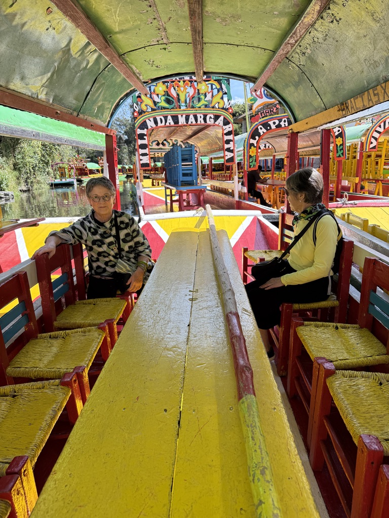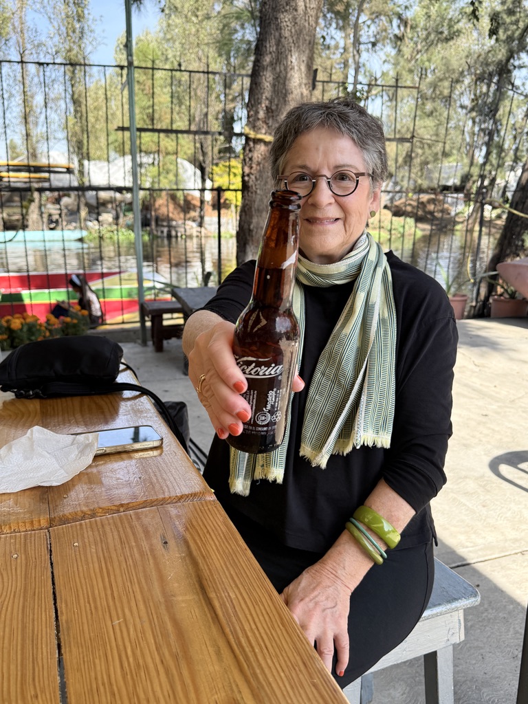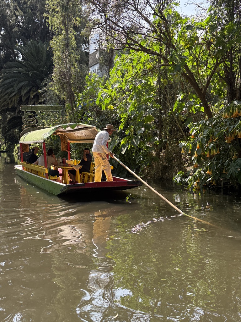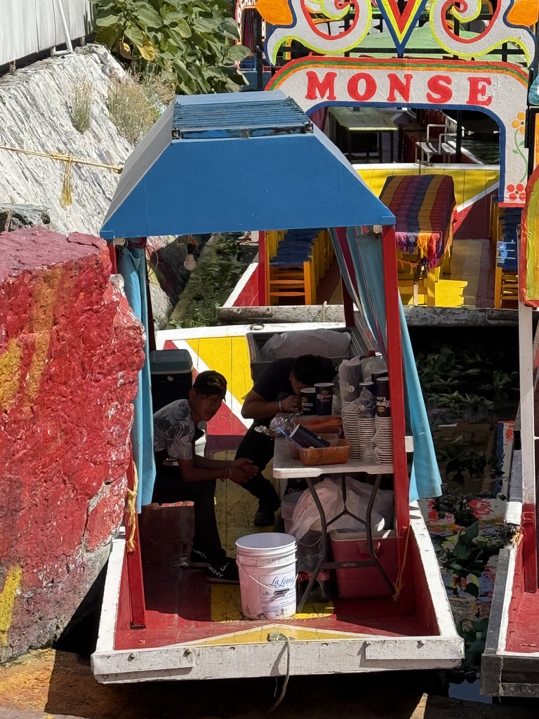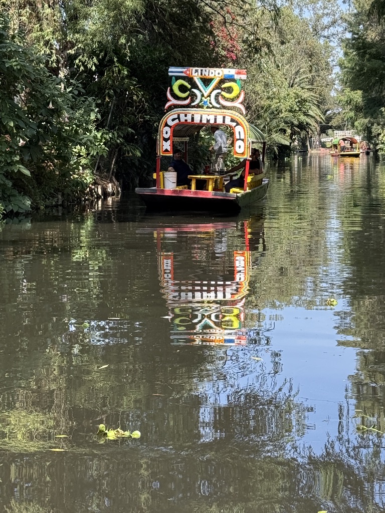 Following breakfast at the little vegetarian place near the hotel, we set out for Xochimilko—a section of Mexico City that I had never really been to. Like Coyoacán, Xochimilko was once an independent municipality on the shores of Lake Xochimilko. It’s in the southern part of the city and has its own distinct history and identity. Many consider it a gritty part of the city and indeed there is a lot of small industry and the area is definitely on the lower end of the economic scale from Coyoacán. It is well known for its canals. Historically, what is now Mexico City had a complex lake and canal system. Today the canal system in Xochimilko is filled with colorful gondola-like boats called “trajineras.” The canal system prompted Xochimilko to become a UN World Heritage site. It’s a bit touristy, but we had lots of fun. We rented our own boat with its own “el capitan”…. And trolled the canals for about an hour. Along the way, even smaller boats come close to our boat; they offered tequila, beer, flowers, and snacks for purchase. Along the way, we got off the boat to sit in a little outdoor patio where we had quesadillas and beer… and then got back into the boat.
