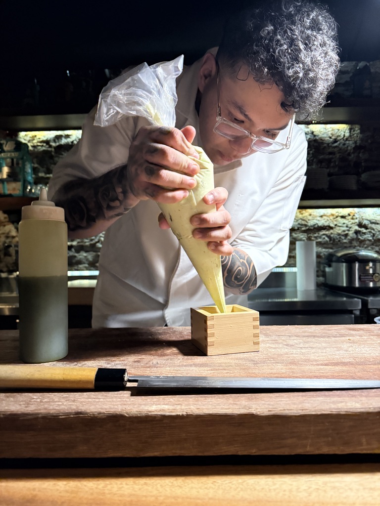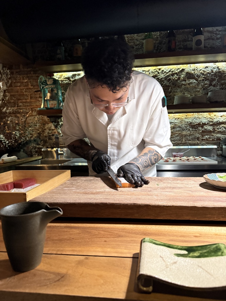 And then we were off to dinner at Hiyoko. While flying to Mexico City, I watched the Eva Longoria film on her favorite eating places in Mexico City. She had a lot of interesting places but many were either extremely high-end or too far away. This one stuck out. It is located in the Little Tokyo section of the city, and is absolutely beautifully appointed with just one very long wooden counter that seats about 25 people. Carol, Adrienne, and I studied the menu which was one of those menus that had some words that are not possible to translate and was a combination of Japanese food terms mixed with Spanish words. Eventually, the waitress found an English version.