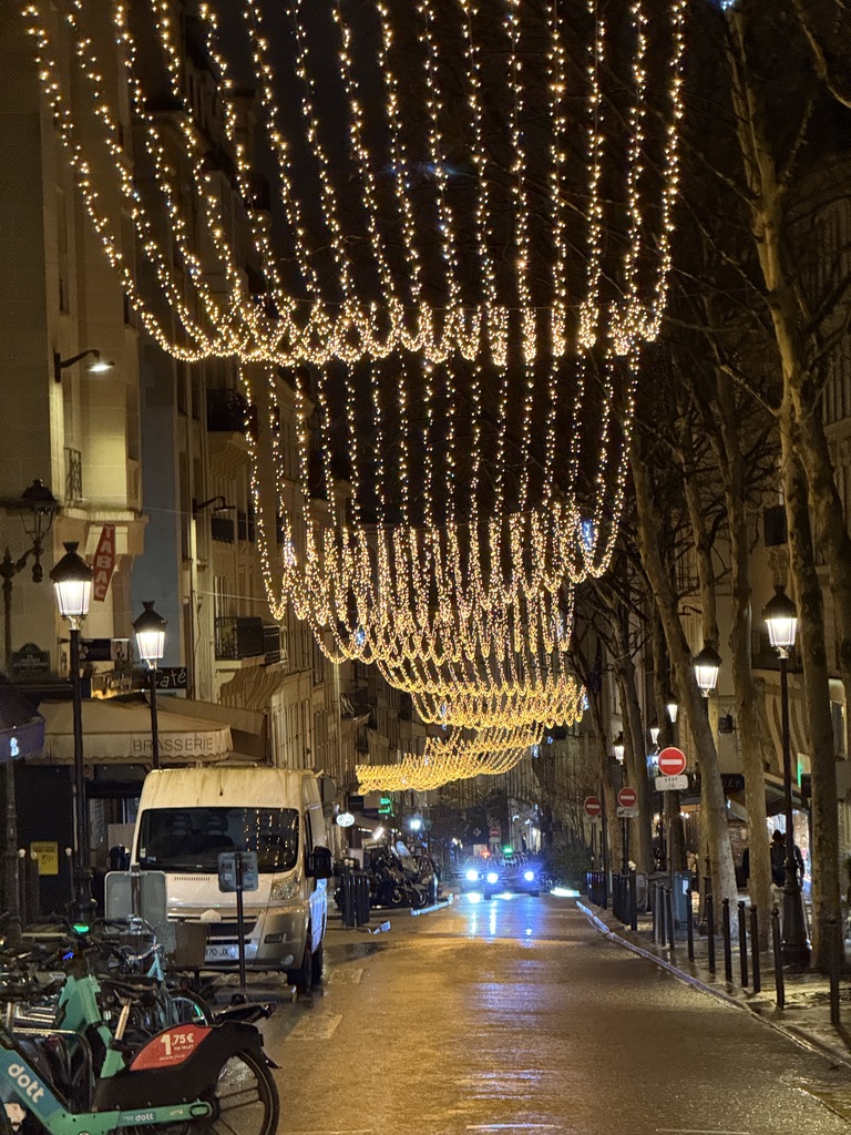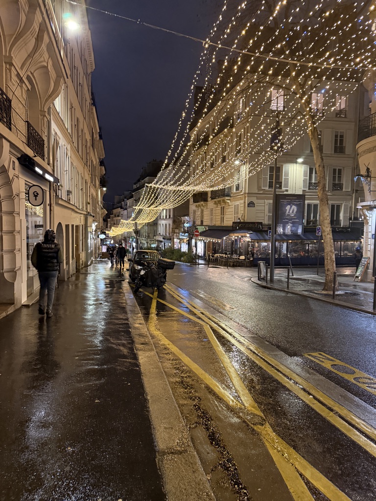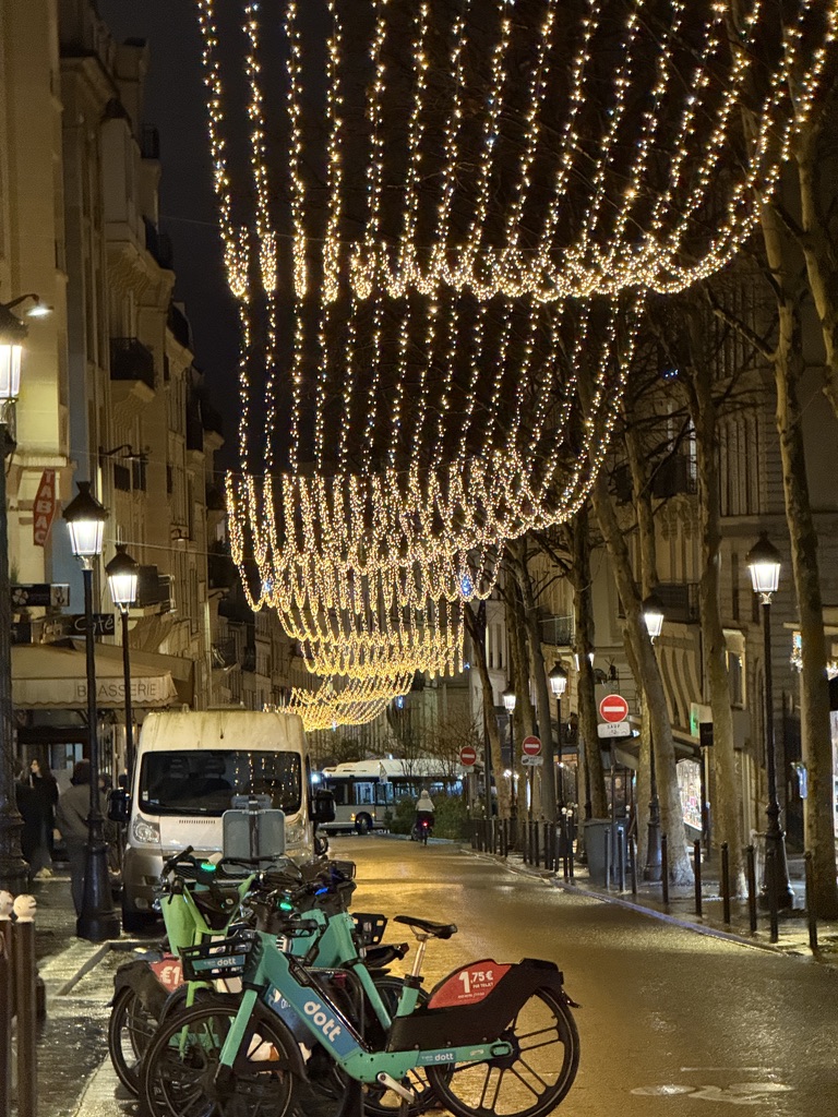 We walked along the decorated streets in Montmartre back to the hotel—mostly on Rue de Martyrs which did a really nice job of adding lights across the facing sidewalks.