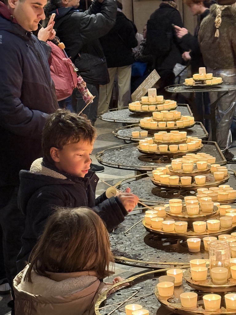 Another touch of contemporary life, there are credit card tap machines all over so that you can pay for your votive candles without the need for a cashier or carrying cash. While the candles are $2 the prompt on the screen lets you pay whatever you want, and has pre-set amounts from $10 to $50. Lots of people were buying candles. Not us.