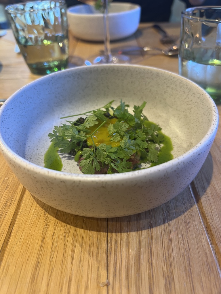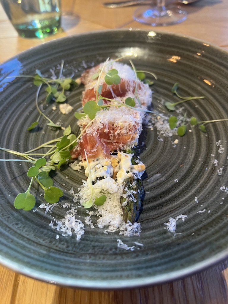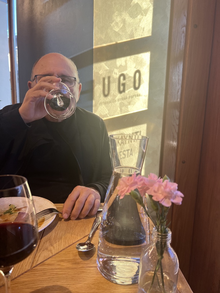 From Pikisaari we headed back toward the center of town to have dinner at Hugo – a restaurant we had read about. While we hadn’t intended to order the full six-course meal, we got very tempted when we read the menu. And the six courses, they promised us, were each quite small. Thus, we convinced ourselves it was OK since we never had any lunch. What they didn’t tell us was just how wonderful every morsel would be. From the asparagus soup that was presented initially as a medley of trout roe, small pieces of asparagus, tiny toasted malt bread crumbs, crunch brown bread crumbs, egg whites and fresh chives—on top of which they poured this amazing asparagus puree…. To the beef tartare with marinated cucumber juice, crispy egg, horseradish, parsley and egg yolk…. To the wild garlic risotto with scallop and scallop foam… to the wagyu beef with fried cauliflower.. to the amazing dessert—–the meal was memorable, and Hugo is a sweet place with very friendly staff. We sort of rolled out of there, very happy we had to walk about a mile to get back to our hotel. Hopefully, we walked some of those calories off (??) By the way, there are a lot of stories about cauliflower in Finland; I’ll try to relay the point tomorrow. Too tired now. By the way, this gourmet Finland is also something that has emerged in the past 15 to 20 years. When we lived here, there were very few (if any) restaurants exploring creatively with food. Food was pretty basic. Of course we didn’t have any money, so maybe we just didn’t know what was out there. But I truly think these kinds of places have come into being in recent years.