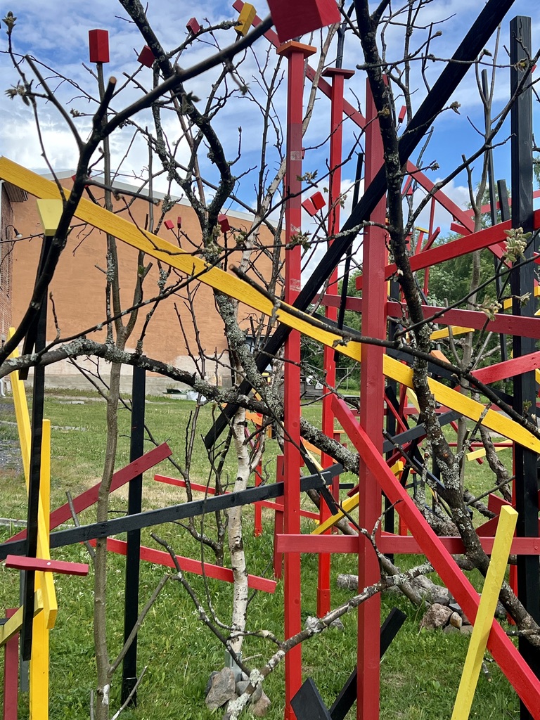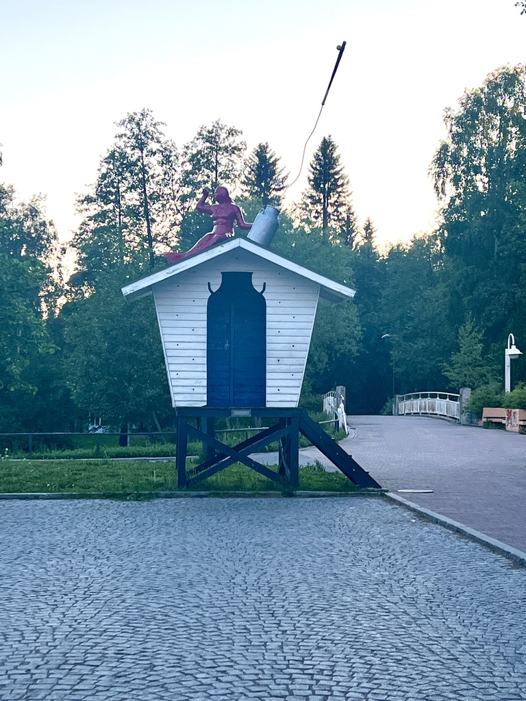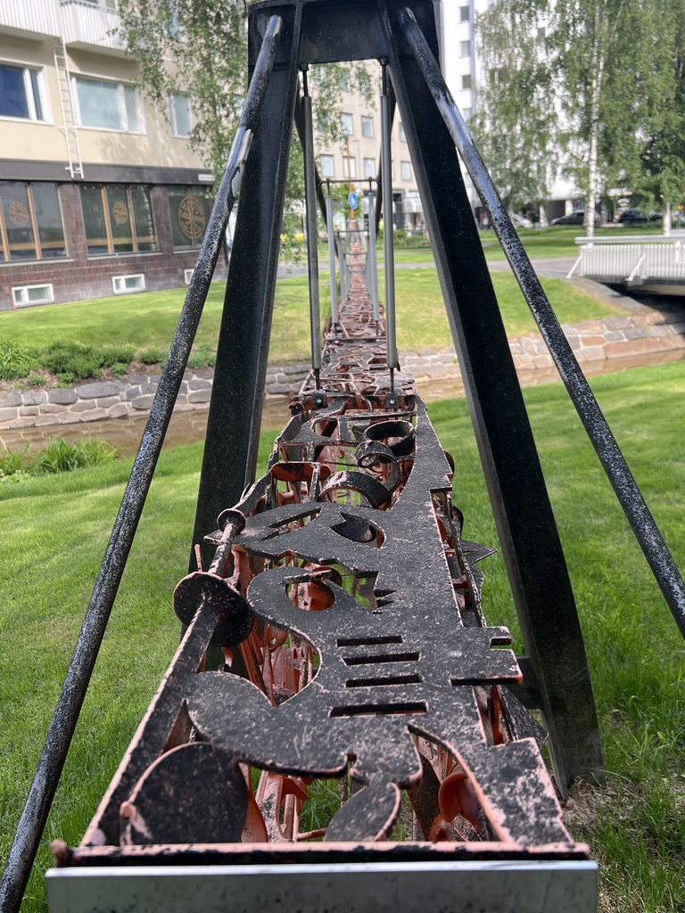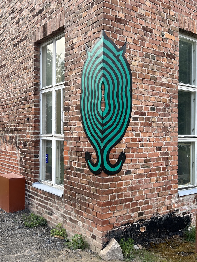 From the market area, we wandered across the bridge to Pikisaari, an island that is part of Oulu. It was historically the location of shipyards, and the only inhabitants were the workers of the companies. Today, Pikisaari is an artists colony with studios and housing for artists and craftspeople. Some time in the 1970s the city turned over the site of a former wool mill to the Arts and Crafts School and later a new school building was completed. It was fun to walk around and find sculptures and other art forms along the waters edge, in the forests, and on the walking paths.