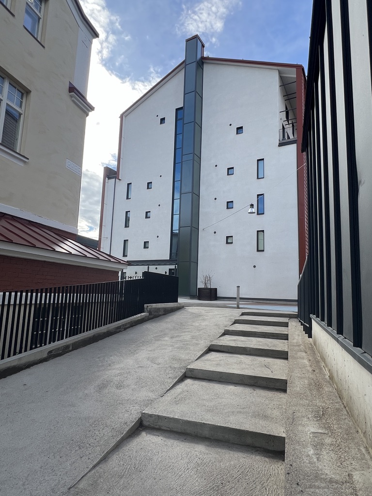 Lasareti is located within an arts complex, so as we arrived to check in there was a concert right outside. It’s also very central so we can easily walk everywhere. Right after checking in, we headed out to see the town—passing the art museum and the history museum, the main church, and many pedestrian-only streets. We also traversed a wonderful park with numerous bridges that enable you to move easily over small lakes and the Oulu River which meanders through the park. Finnish cities tend to have numerous, large, very well-maintained parks so this was not unusual, but it was delightful. There is public art scattered throughout the city. Finland invests heavily in promoting the visual as well as other arts, so the products of those investments are visible. Frankly, although the design quality of products, graphics, and buildings is extremely high, the visual arts (painting, sculpture, etc. done as “art”) has never been at the standards of Finnish fabric, clothing, dinnerware, furniture, and other consumable products.