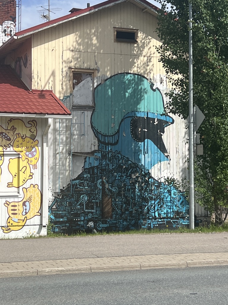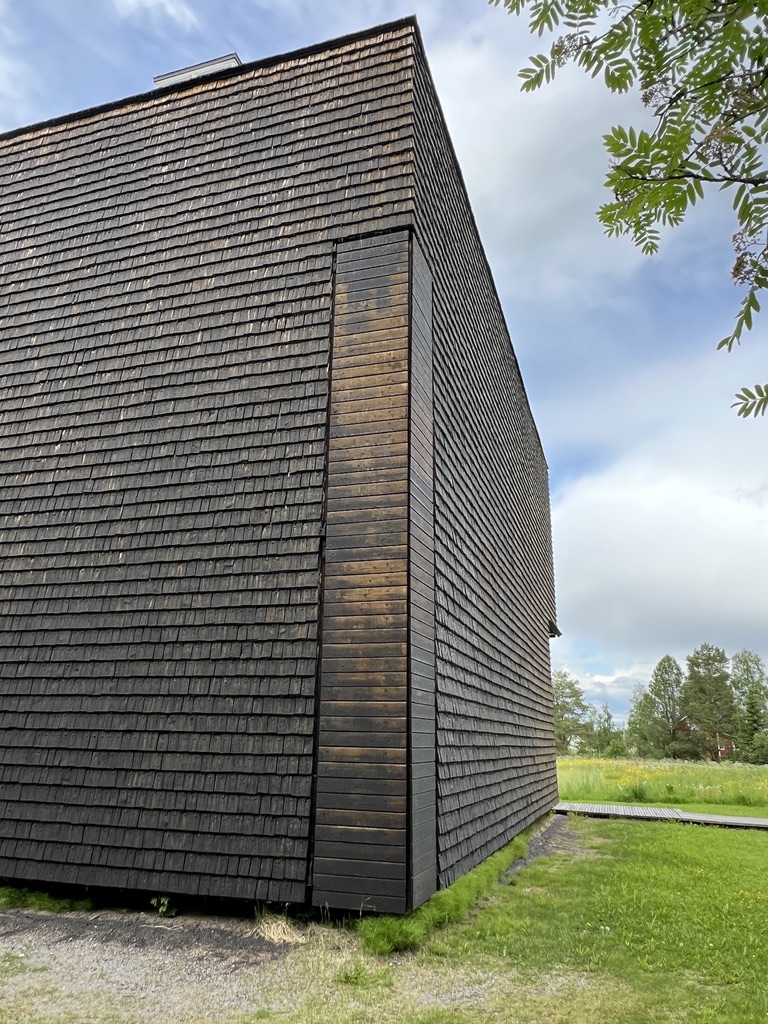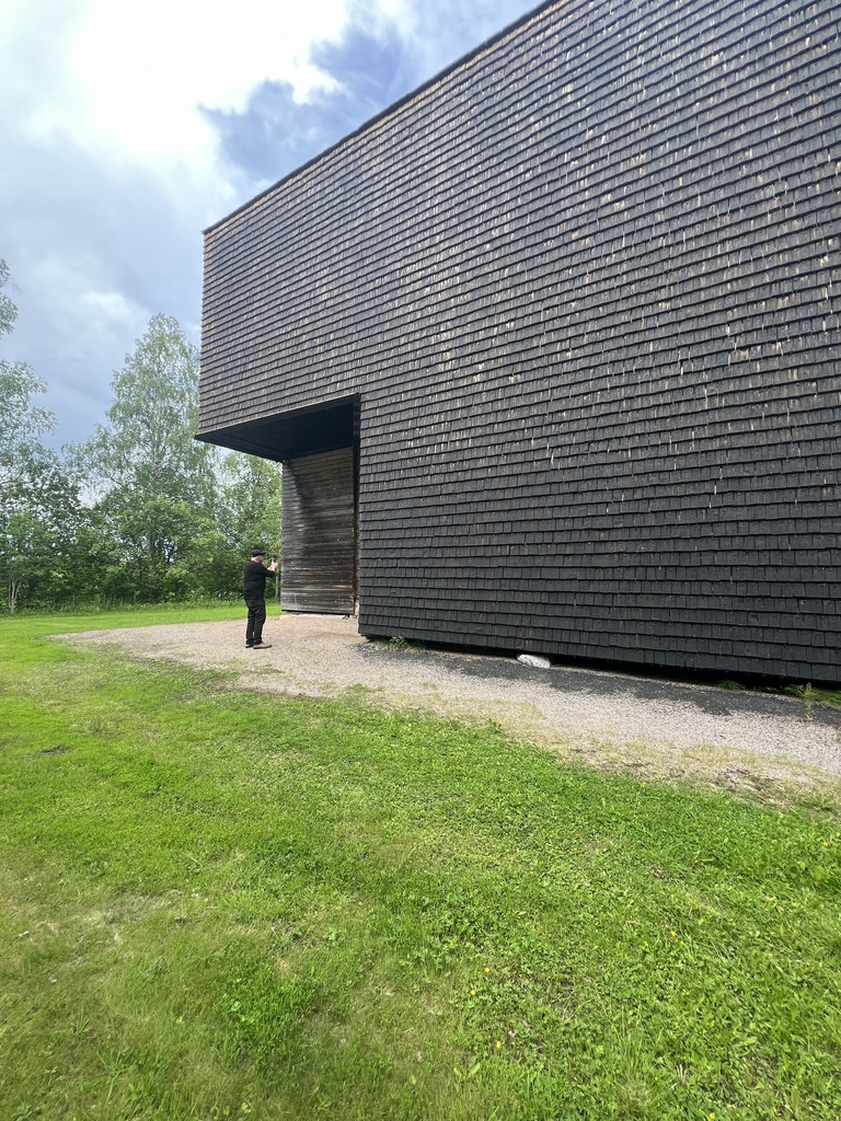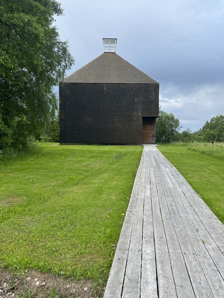 After breakfast, we headed to Kärsämäki, about 110 miles south of Oulu to see a very interesting church dubbed the “shingle church of Kärsämäki.” First you need to understand that although Finland is a very non-religious country, there remains a religion tax of about 1%. With this money, it appears that the government (or maybe the church itself) commissions the construction of lots of churches throughout the country. Officially, the majority of Finns are Lutheran, but churches are empty on Sunday mornings. Most Finns say they are agnostic (at least those we know). But they keep building new churches and many are exquisitely designed. So, I suppose this tax keeps many architects busy. We had read about this particular shingle church and decided to make the journey. The 90+ minute drive took us through miles and miles of forested roadways and streams, rivers, and lakes. Not a billboard in sight! No potholes. And amazingly well-maintained roads with great signage. As you drive through all of this unbuilt land, you truly get the sense of Finland’s reality: 5.5 million people living in a country whose land mass is the size of California (population about 40 million). We made a little pit stop at the Marimekko Outlet store nearby, which is in a small mall. And as elsewhere in Finland there was a well-equipped large room in the mall that was for kids to play–supervised by a qualified “teacher” so that parents could shop without distraction.