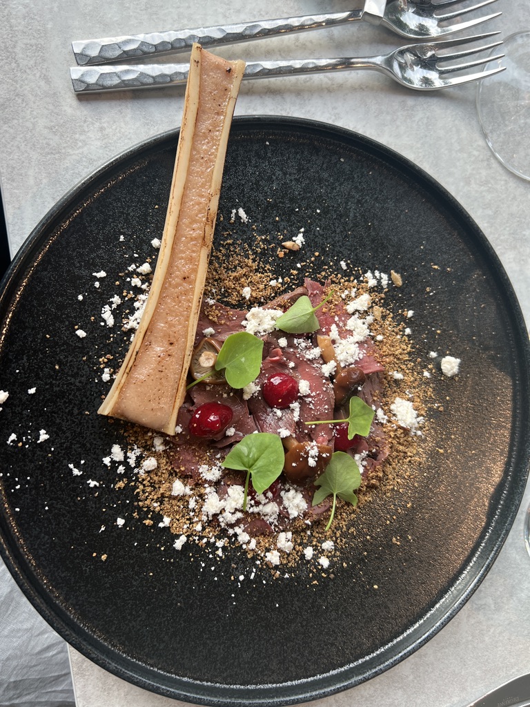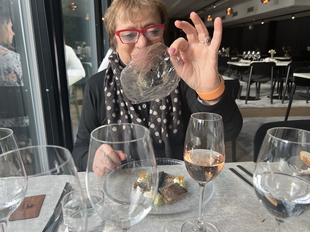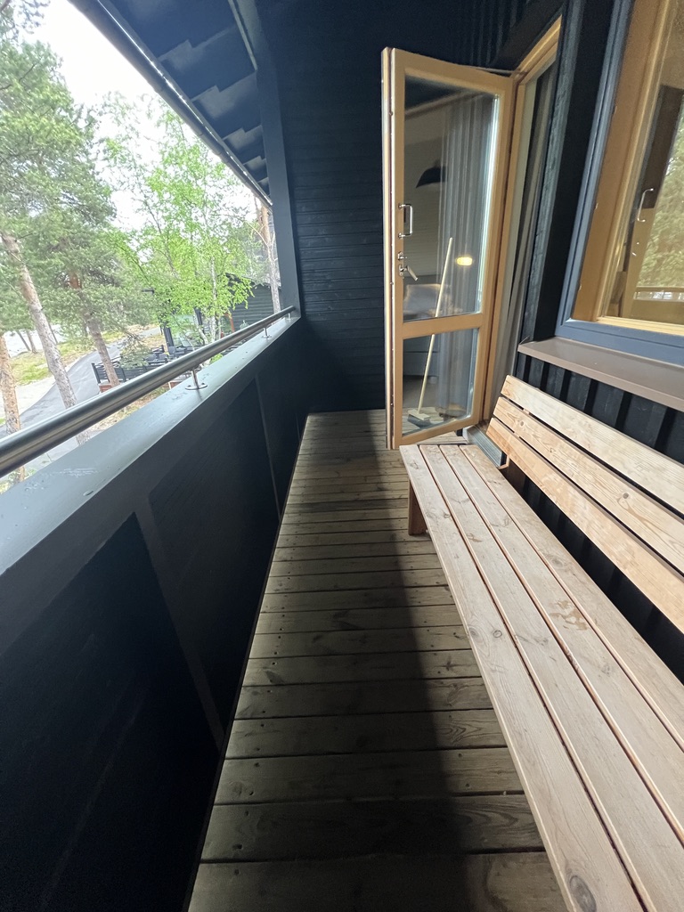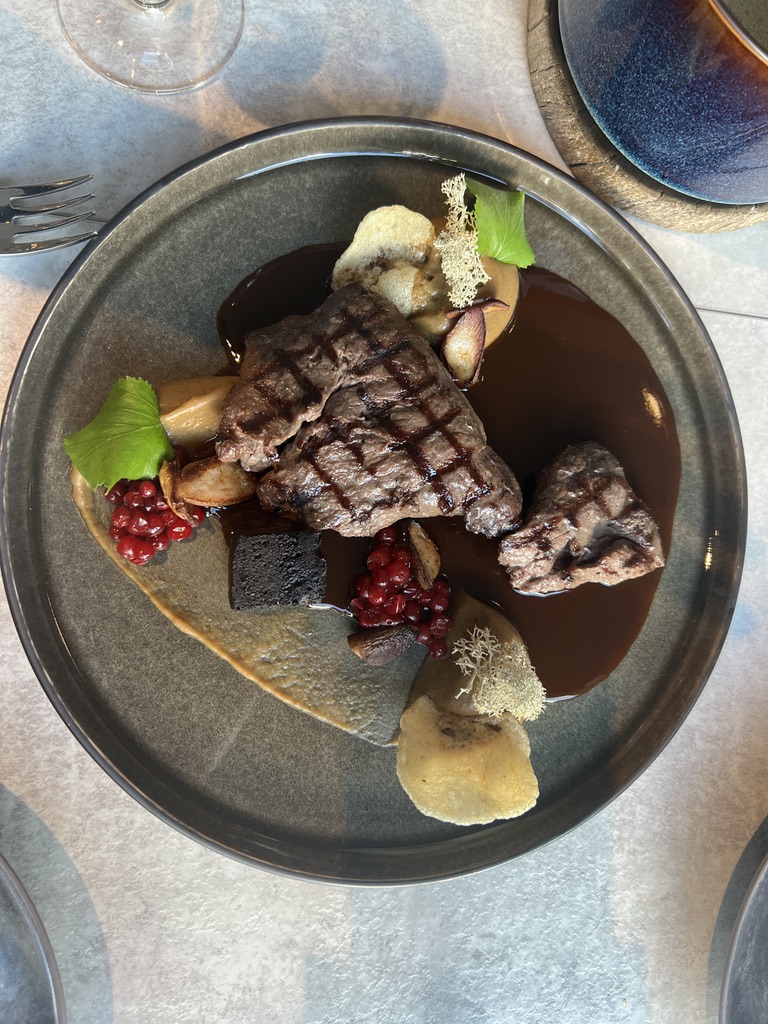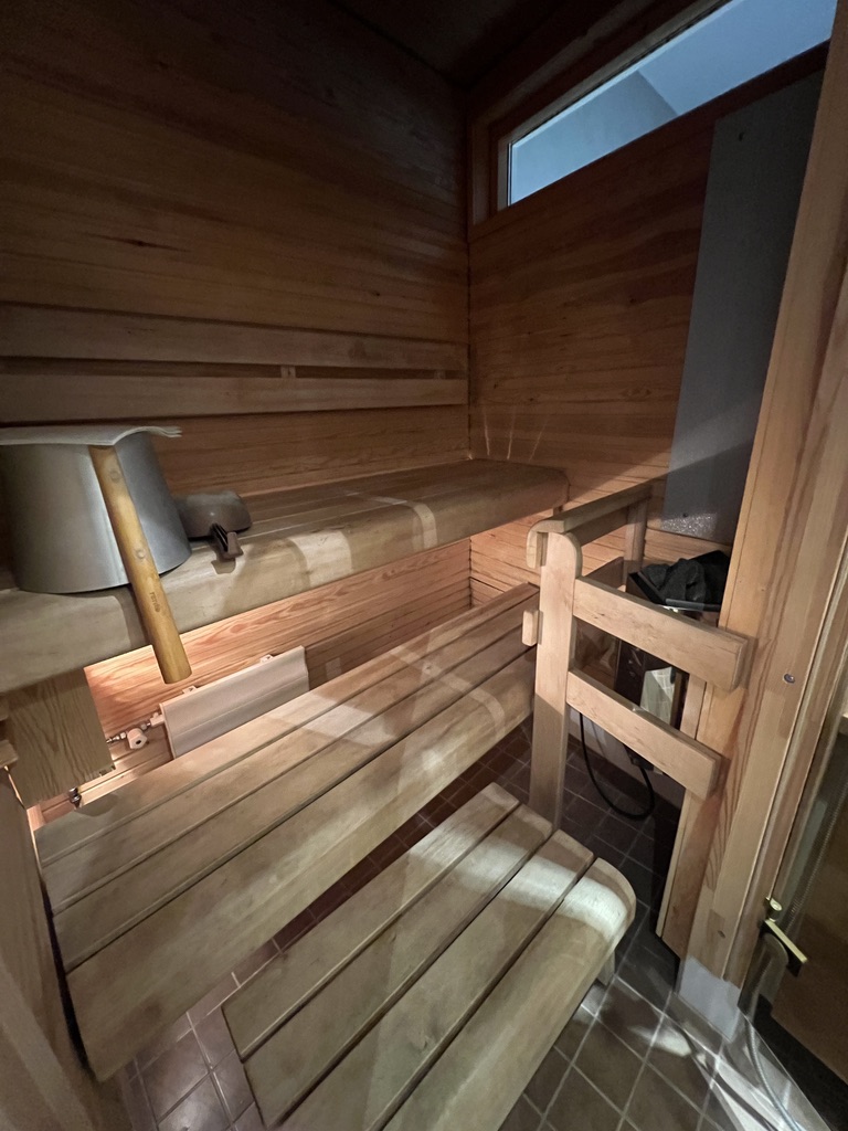 Tonight we had dinner at the hotel’s restaurant Aanar which turned out to be a great choice. Floor to ceiling glass with tables along the river edge. Wonderful menu and preparation was fantastic. First a tiny plate of reindeer tartare (compliments of the chef). We chose two starters to share: pickled whitefish with roe, marinated onions and fish cream; and smoked reindeer heart with lingonberry sauce, marinated mushrooms and reindeer bone marrow. Both dishes were great and presentation of each was a visual delight. We then shared two main dishes: arctic char (caught today in the Inari River) prepared with crispy skin but totally buttery fish underneath. It was served with potato puree and dill cream and some baby root veggies—another winner; and reindeer done sous vide with pine needles, mushroom puree, reindeer black pudding, and lingonberry red wine sauce… Oh I forgot to mention that the fish came with a literally paper thin, translucent, sculpted thing on the top.. It was really that thin and covered the whole dish. It was some kind of “potato chip”.. or the chef’s interpretation of a potato chip. This guy knows how to prepare food. We shared a dessert that had chocolate sorbet and some berry concoction. A good way to end the meal and head to our river view room to try out the sauna.