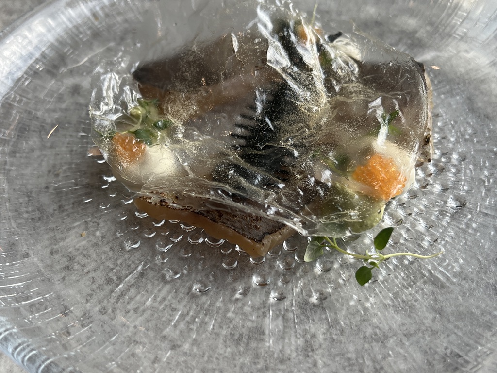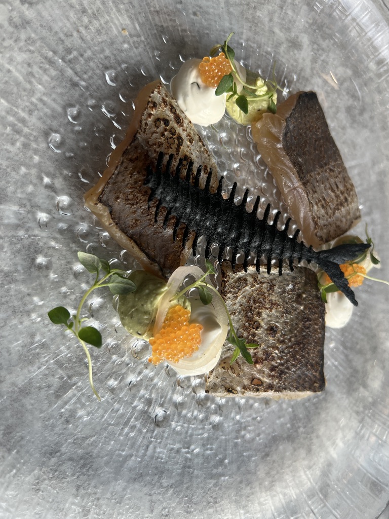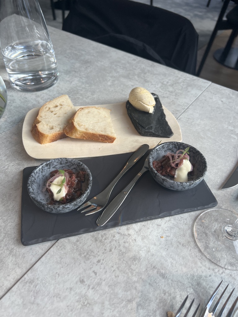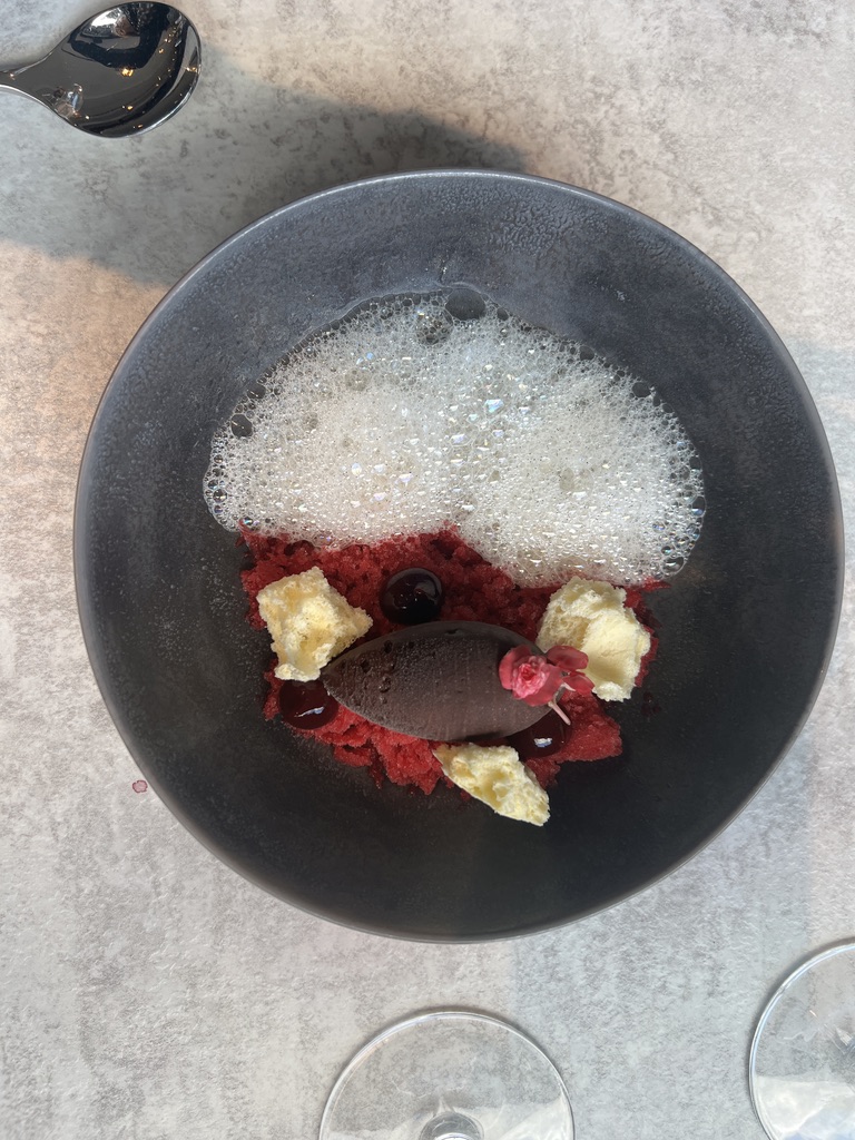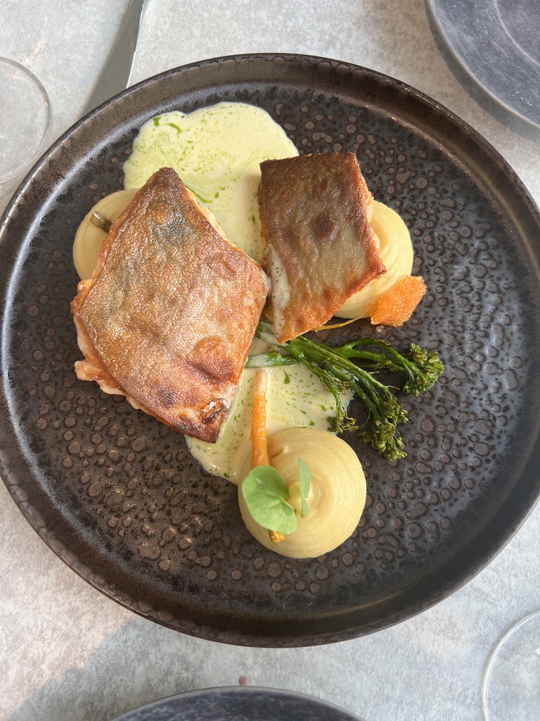 Tonight we had dinner at the hotel’s restaurant Aanar which turned out to be a great choice. Floor to ceiling glass with tables along the river edge. Wonderful menu and preparation was fantastic. First a tiny plate of reindeer tartare (compliments of the chef). We chose two starters to share: pickled whitefish with roe, marinated onions and fish cream; and smoked reindeer heart with lingonberry sauce, marinated mushrooms and reindeer bone marrow. Both dishes were great and presentation of each was a visual delight. We then shared two main dishes: arctic char (caught today in the Inari River) prepared with crispy skin but totally buttery fish underneath. It was served with potato puree and dill cream and some baby root veggies—another winner; and reindeer done sous vide with pine needles, mushroom puree, reindeer black pudding, and lingonberry red wine sauce… Oh I forgot to mention that the fish came with a literally paper thin, translucent, sculpted thing on the top.. It was really that thin and covered the whole dish. It was some kind of “potato chip”.. or the chef’s interpretation of a potato chip. This guy knows how to prepare food. We shared a dessert that had chocolate sorbet and some berry concoction. A good way to end the meal and head to our river view room to try out the sauna.