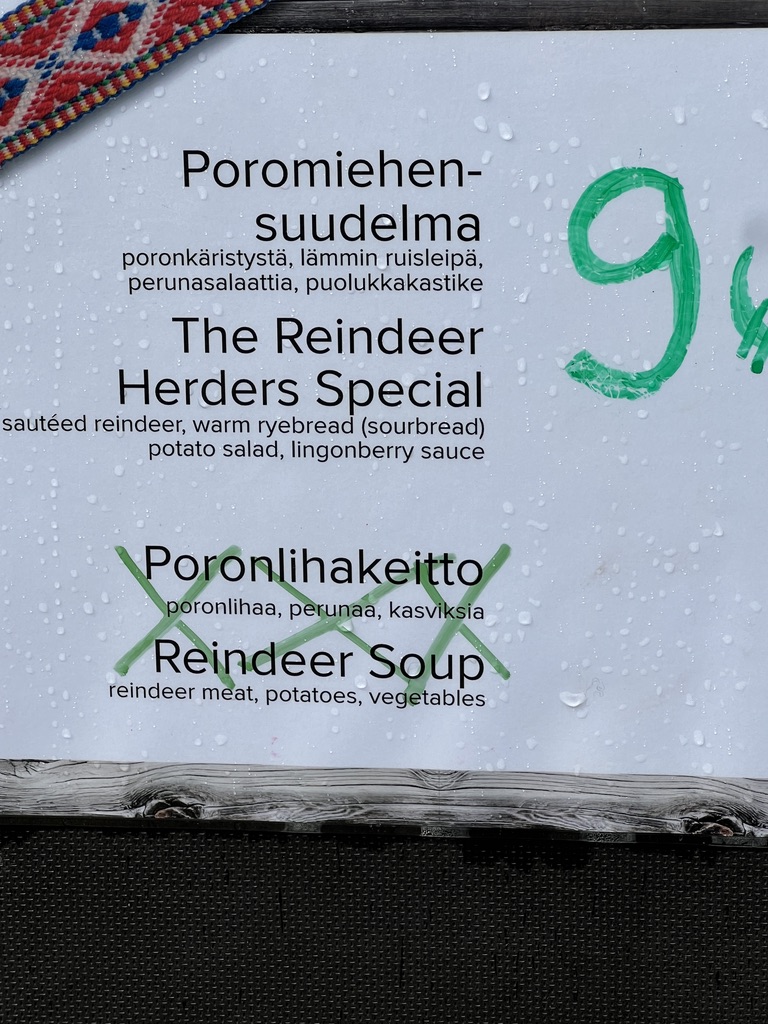 We headed north and drove about 200 miles. Once again, a wonderfully paved, pothole-free, billboard-free drive alongside and over untold numbers of crystal-clear lakes and rivers, always with forested woodlands on either side of the road. Green, lush, and fairly low. Finland’s trees never grow very tall because of the climate and up north trees are even shorter. We only ran into one lone reindeer (strolling along the road and minding his/her own business. The road is one lane in each direction with speed limits set at 100 kmh (60 mph). We shared the driving and stopped a few times to either admire the view or to get a snack or to take a 15-minute power nap or to stroll in one of the small towns along the way. We stopped for a simple lunch at some café where we had salmon soup that was fresh and quite good. It also came with what was described as a “pancake” but we would call it a crepe.. with cloudberries (lakkoja). Turns out the woman working at the café grew up very close to the café (which was 75 miles north of Rovaniemi) but had left and lived/worked in London for 35 years -– in banking!; she returned just 5 years ago to take care of her ailing father. She talked about the difficulty of adjusting back to Finnish life.. and especially the challenges of adjusting to life in very very rural northern Finland.