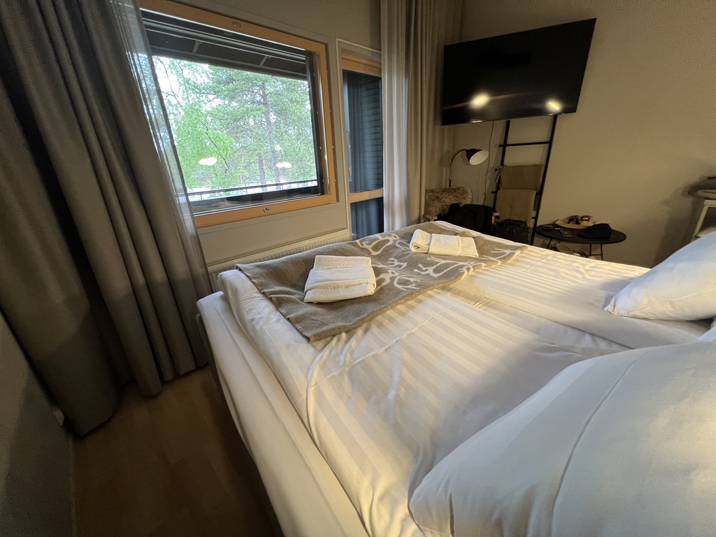 Then we continued our journey past scores more lakes. Indeed, there are 188,000 lakes in Finland that are at least 5 acres large; they don’t even count smaller lakes. And 10% of Finland is comprised of lakes, many with very small “islands” popping up all over the lakes. We finally arrived at Wilderness Hotel Juutua in Inari. It is quite lovely. Our room faces the river (Juutuajoki) which runs extremely fast although we can’t figure out why since there aren’t any real mountains in Finland. We think the water is coming from a very large lake (Paatera) and perhaps that lake is at a high elevation ?? We have our own in-room sauna, which is very nice, and the room and the hotel are both very tasteful and well appointed. Simple, lots of wood. And totally opposite our hotel in Rovaniemi which was filled with so many mirrors in the lobby I was getting dizzy and also got lost finding the elevator. The room was similarly decked out. Tonight’s hotel is like its setting… simple, tasteful, woodsy.