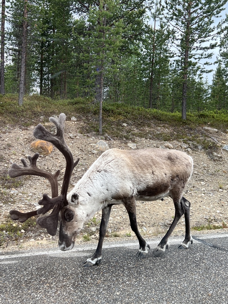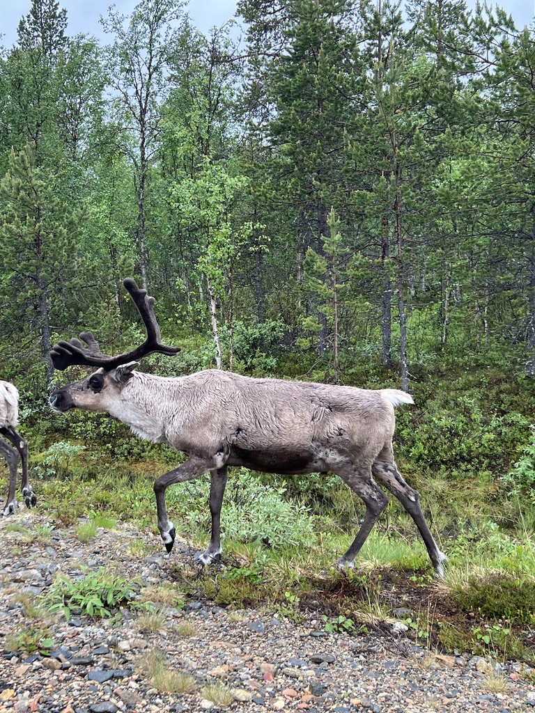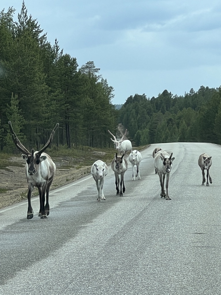 Today was truly a car day. We drove about 240 miles from Inari (left after breakfast) using a route that took us a bit further west than the way we came to Inari on Saturday. This route was longer (about 40 miles more and about 90 minutes more). Figured it would be boring to see the exact same lakes and trees as we had seen going north. Definitely a good idea !!?? Over the first two hours we counted just 20 cars in either direction. But we saw lots and lots of reindeer. They are not very smart and do not really move off the road, or at least not very quickly. Or perhaps they are very smart and realize that they were here before us and also that we will stop for them. They sort of linger a while and then dash off. We saw whole families of reindeer as well as a few very independent ones (or maybe some lost ones). This route was really slow since huge parts of it were unpaved and later in the journey we came upon large swaths of road that were being re-paved so we were driving over gravel for long stretches. I guess they do all road repairs in the summer months so as to have good roads by wintertime. As I’ve mentioned numerous times, the roads are excellent and this is why. They invest in infrastructure!