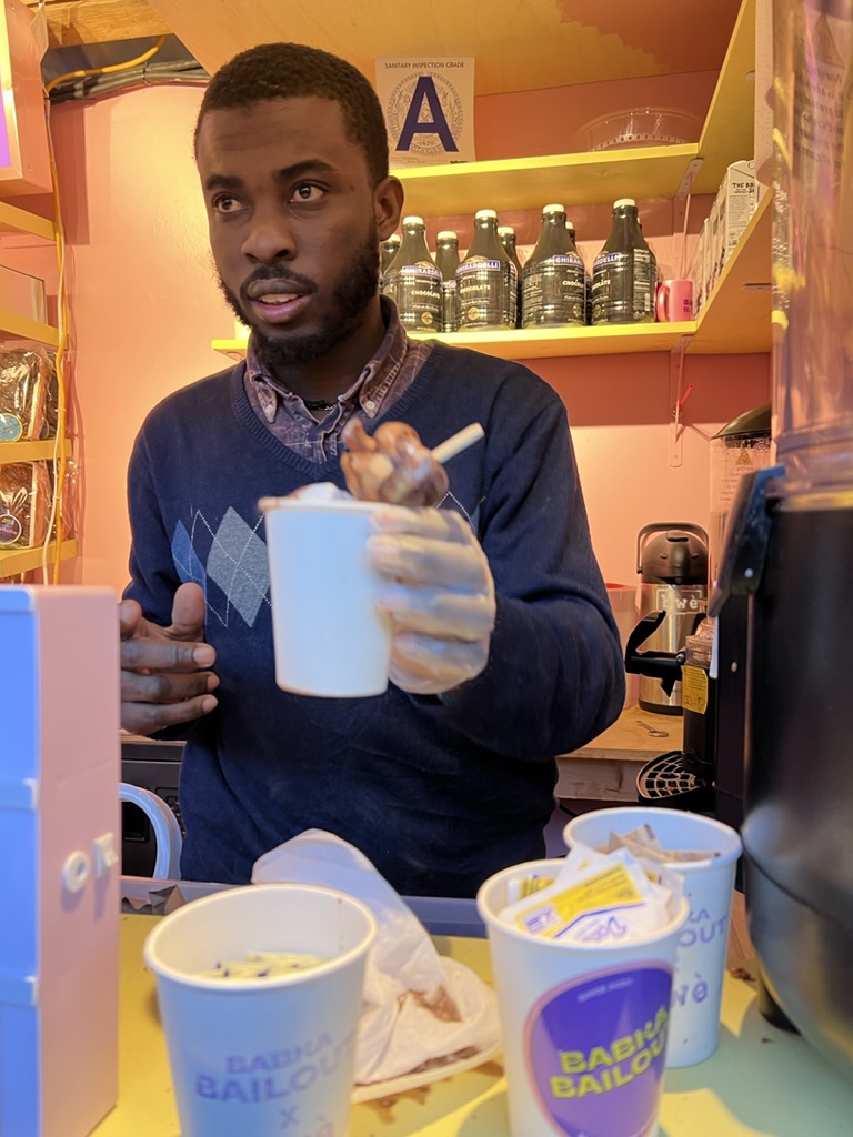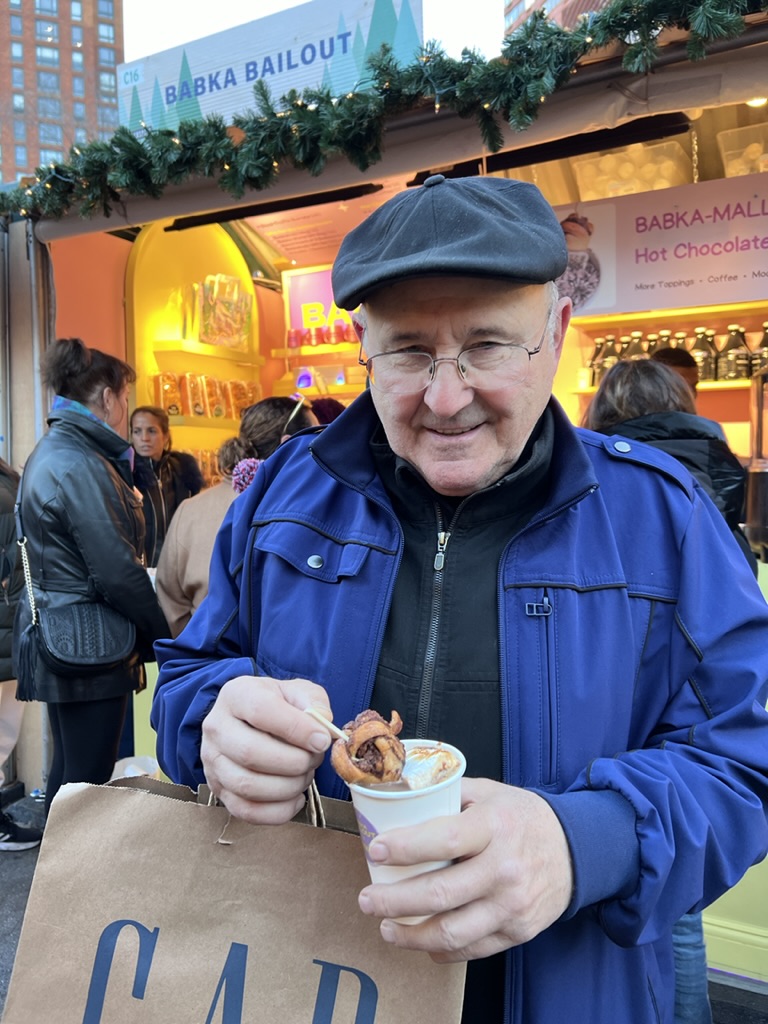 I then met up with Mike at the Union Square Christmas Market which was fun to stroll… and Mike availed himself of a hot chocolate topped with babka and marshmallow! Totally sinful, but it was his birthday.