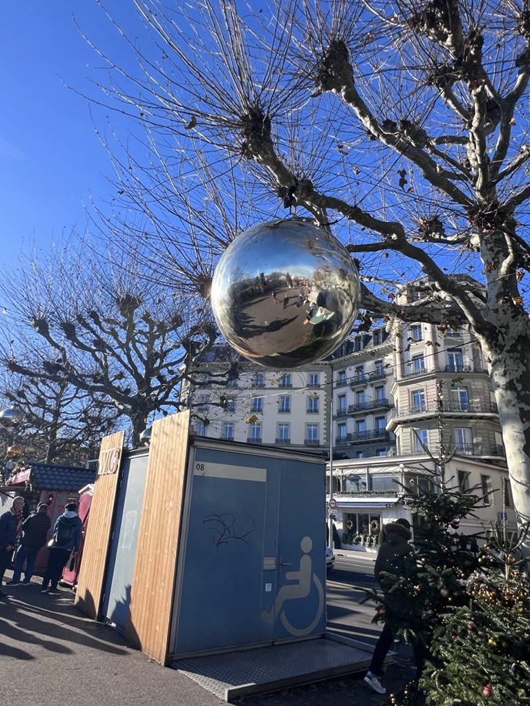 Yesterday, Mike and I strolled to the Geneva Christmas Market (nothing too interesting but a nice walk) and back to the hotel. We are staying at the Longemalle, which we like – smallish, on a pedestrian street in the heart of downtown Geneva. Last night we went to Julia and Julien’s (JuJu’s for short) for Christmas Eve dinner. Julien’s mom and aunt and cousin (from Angouleme—about an hour north of Bordeaux) were there as well. We had met them before at JuJu’s wedding and at previous Christmas events over the years. They are interesting with a long history involving the Mitterrand circle of politicos. So, the conversation was lively. We all moaned the shift to the right throughout our countries and beyond.