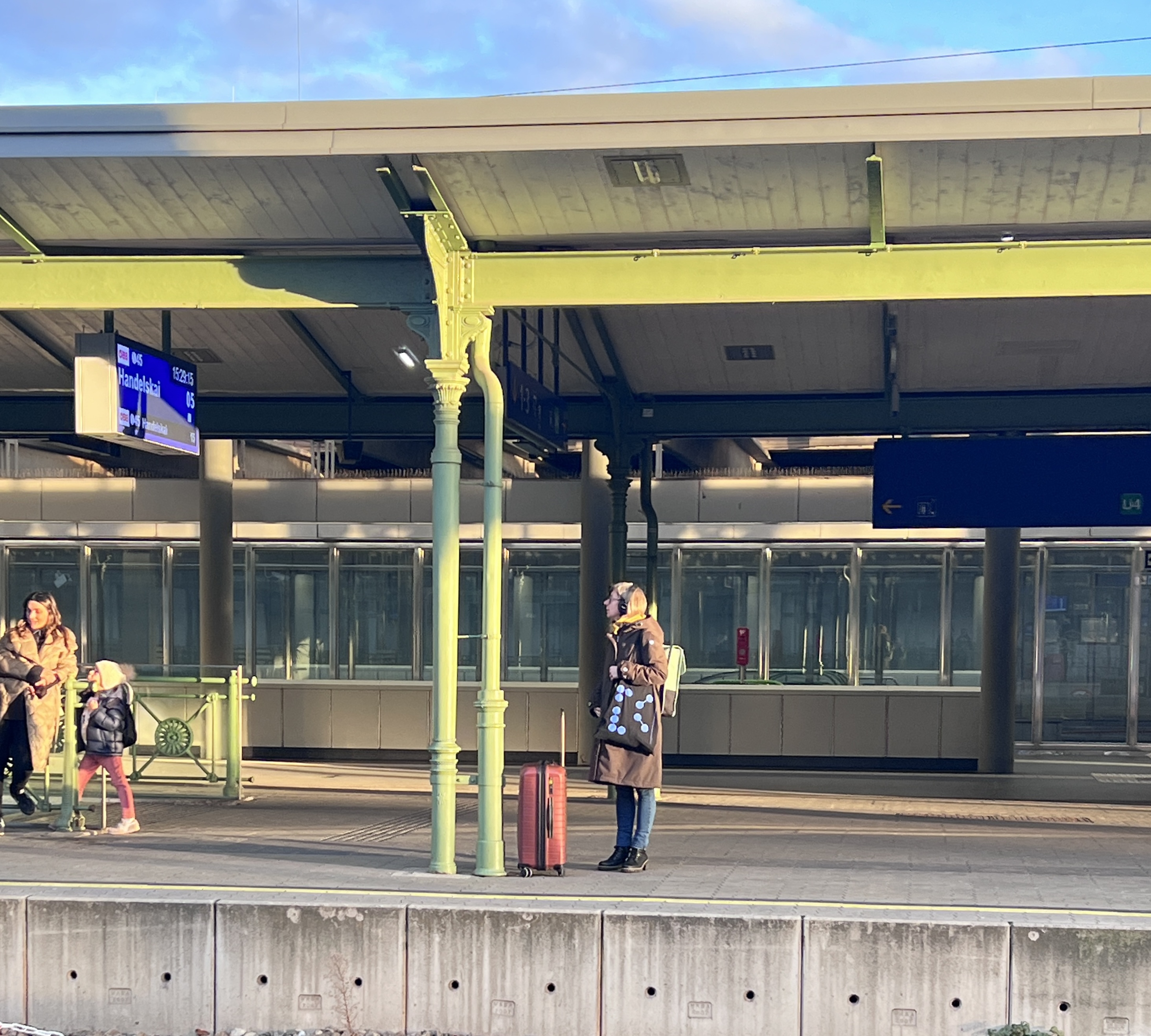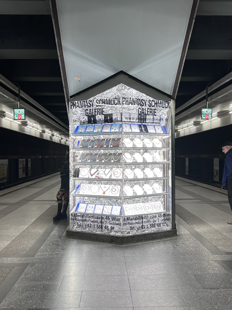 From there, with the sun setting, we took the U-Bahn back to the hotel….somewhat smoothly, although we did wind up initially, on a train headed for the mountains.. But the public transit system is so good that it was easy to regroup and find our way. Like Geneva and so many other European cities, one is supposed to purchase a ticket, but supervision is non-existent and there are no barriers to entry, so people seem to come and go. And in many of the stations, on the platform between the two sets of tracks, there are glass enclosed kiosks displaying and advertising items you can purchase in the stores, including jewelry. These displays house the actual jewelry or clothing or whatever… and seem to remain undisturbed. Imagine that on the BART platforms!