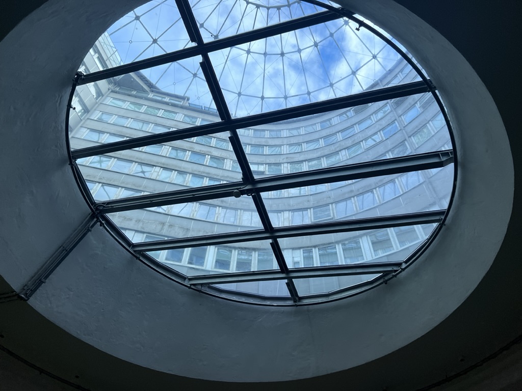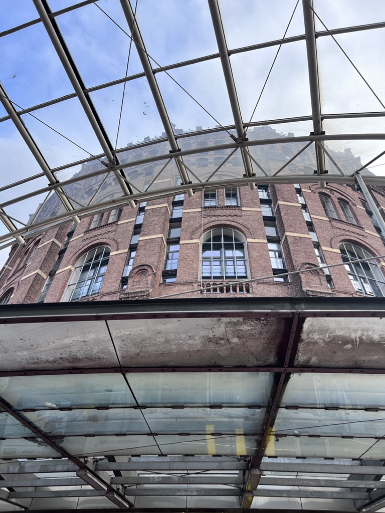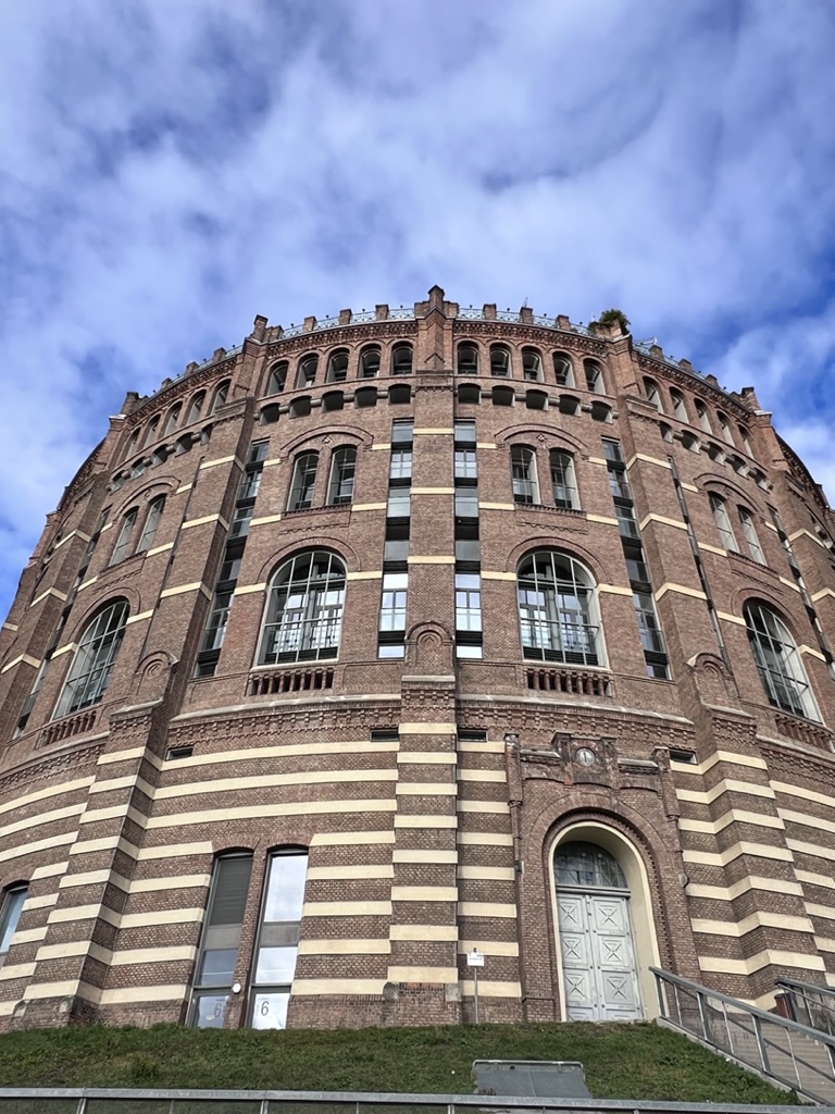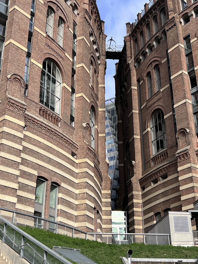 We headed out to Gasometer… and now that we are experts on the U-Bahn (the Vienna Metro) we caught the train which went directly to Gasometer. We had seen the remains of the old gas works cylinders in Rome, but here in Vienna they have taken the four structures built at the very end of the 19th century and created housing. The gasometers were in use until about 1960 and then were shut down. The city preserved the exterior walls and eventually created housing blocks within the cylindrical frame. The city took on the task of remodeling and revitalizing the structures (which were landmarked) and selected four architectural firms to do the design. The challenge for the architects was to create affordable units (social housing) as well as offices and entertainment and shopping within these cylindrical buildings. The four buildings are connected by skybridges. Altogether there are about 800 apartments with about 1,600 tenants and about 70 student apartments. We explored the buildings although we could not see any actual units, just the public spaces and the exteriors.