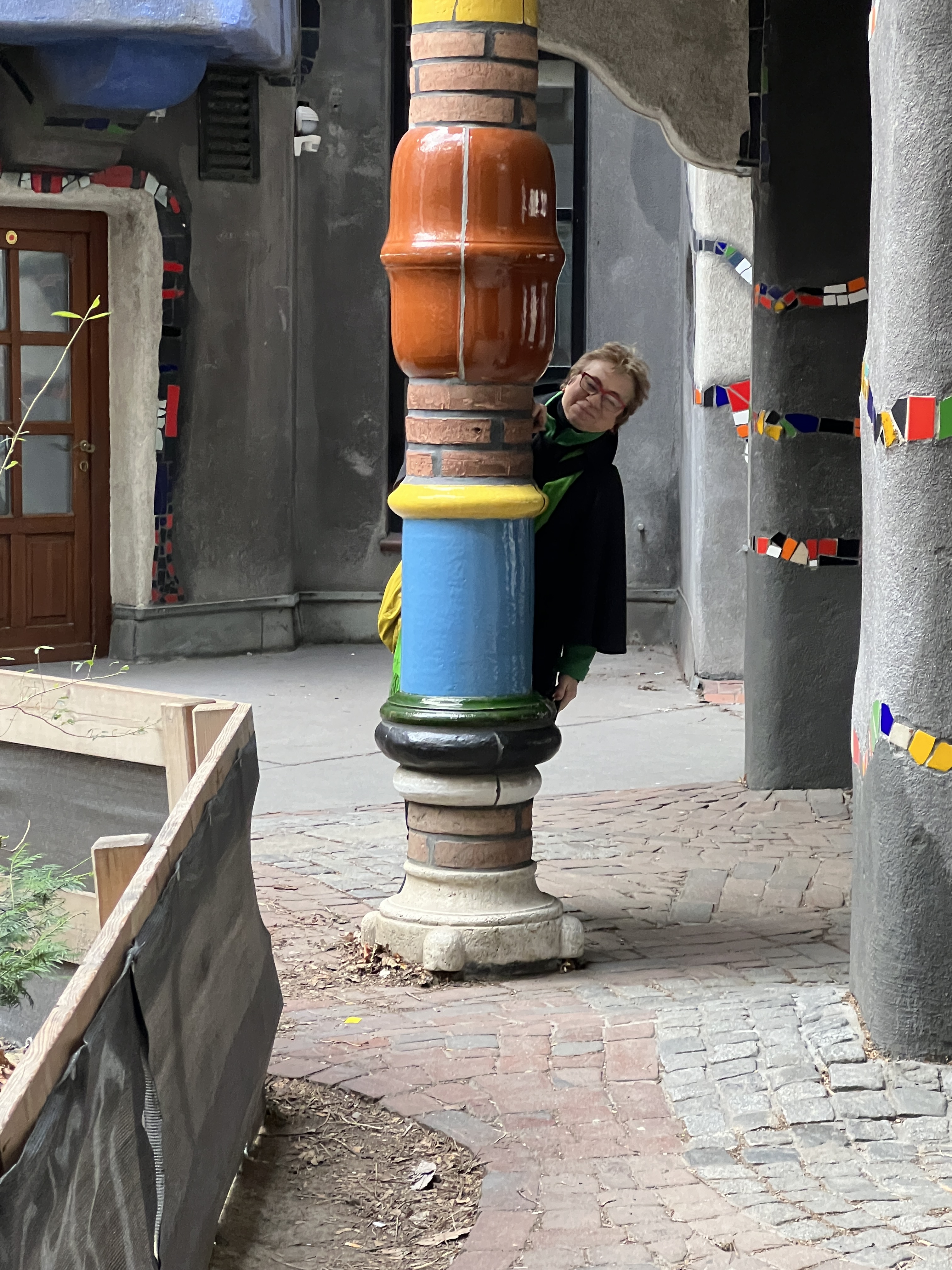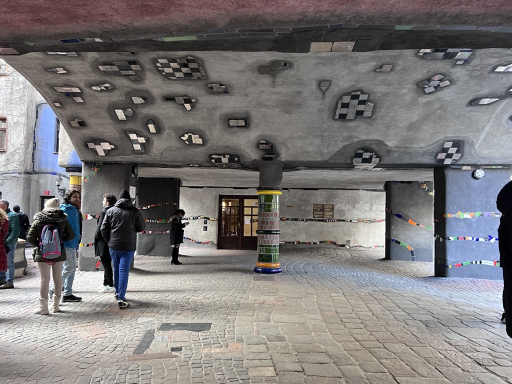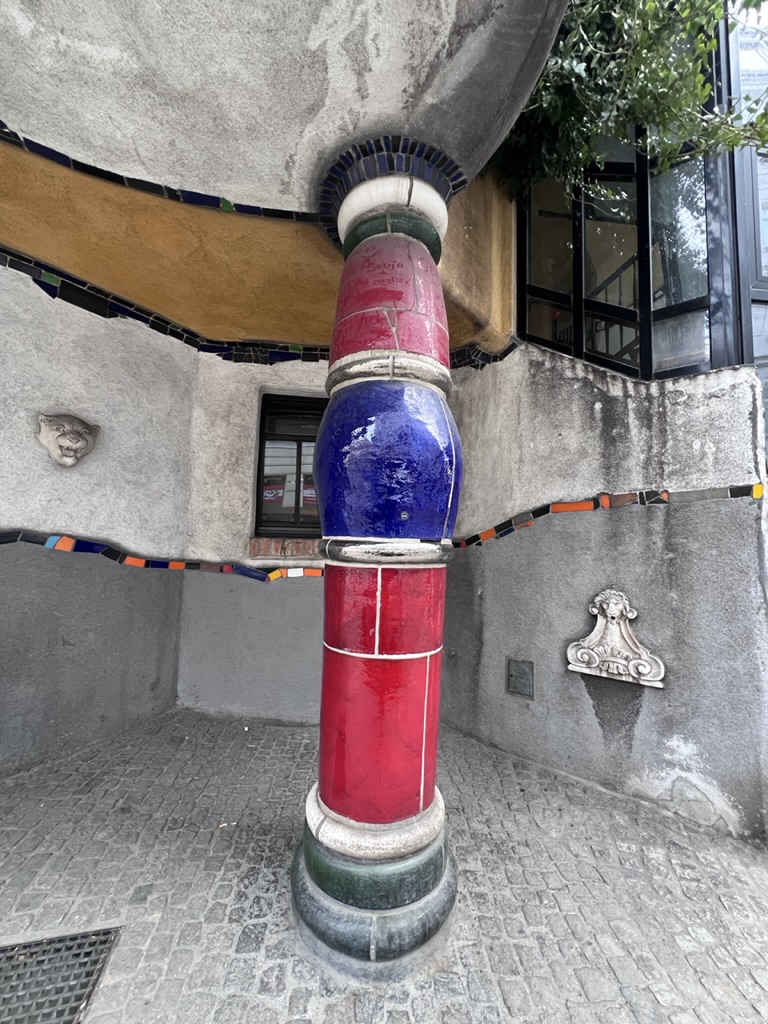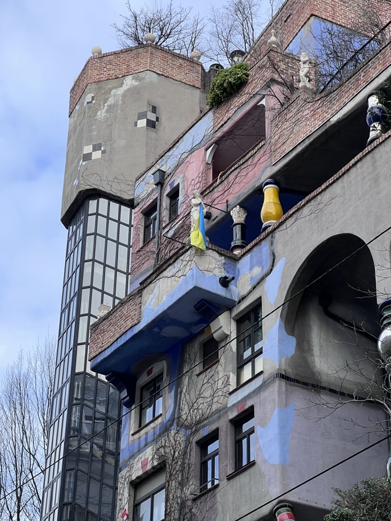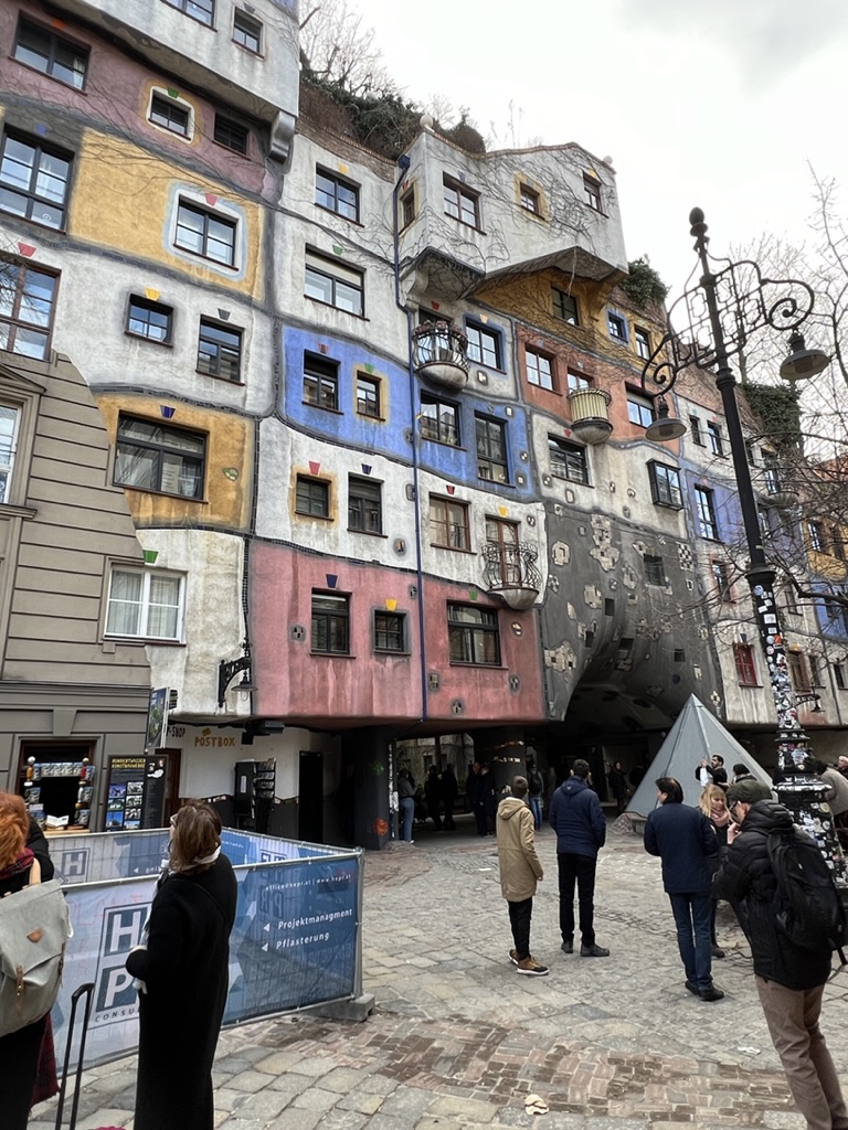 We then hopped back onto the train to get to Hundertwasserhaus… one of Vienna’s most visited residential buildings in a residential district—a collaboration begun by an Austrian artist named Hundertwasser who was interested in architecture (but not an architect). Initially, he wrote and published a lot about architecture and his theories about how people should live with nature in urban areas and lectured at universities about the need for compatibility between nature and people. Eventually the Austrian chancellor recommended that Hundertwasser be given an opportunity to implement his ideas by constructing a residential building. But since Hundertwasser was not an architect, the city needed to provide him with an architect with whom he could work. Josef Krawina was selected. The building was to be for social housing.