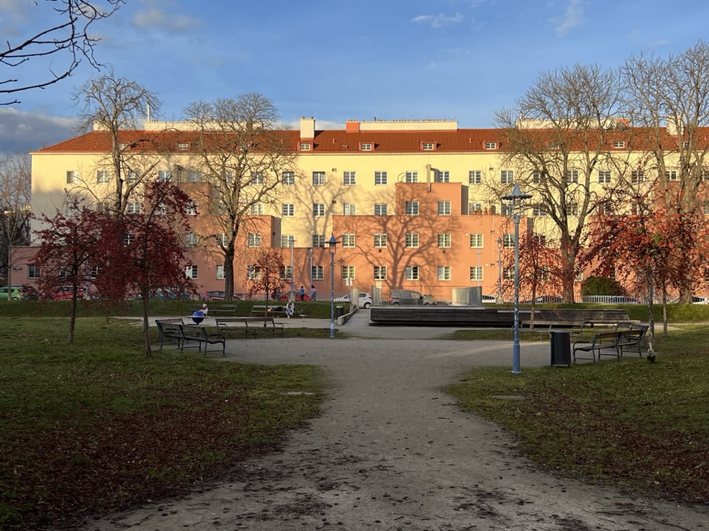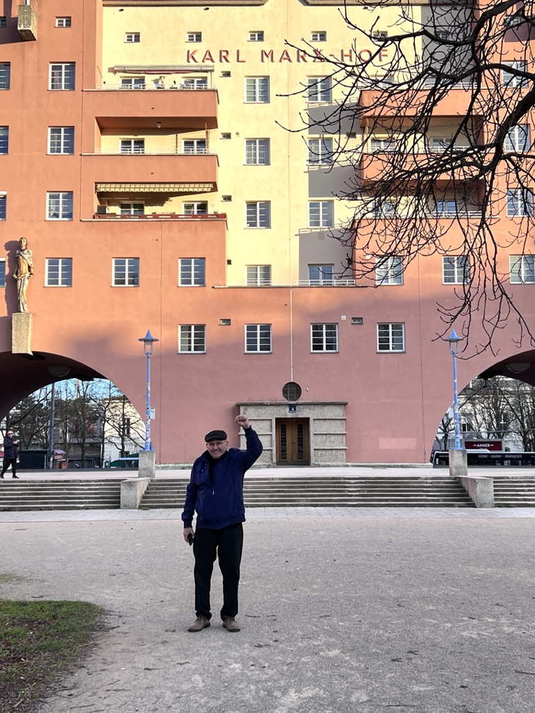 Karl Marx Hof is more than a kilometer long and I think it was the longest continuous residential building in the world at that time. It was designed by one of Otto Wagner’s students (Otto Wagner was the architect for the Art Nouveau buildings I noted yesterday or the day before). The building was constructed between 1927 and 1930. (per Mike… “I’m stunned that they could do this in such a short period because 50-unit buildings in Oakland can take that long!”) And here there are about 1,400 apartments.