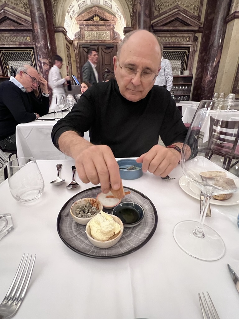 First, last night’s dinner at Vestibul was quite wonderful, although Mike was being very careful in his selections. We started with two appetizers: chestnut soup for Mike and an artichoke dish for me. For main courses Mike had the char and I had wonderful duck. And of course, we ended with a great desert—can’t be in Vienna on a diet. As I remembered, food in Vienna is rich and complex. Vestibul is located in the Burgtheater’s imperial carriage entrance and marble hall, so the setting inside is definitely “royal.”