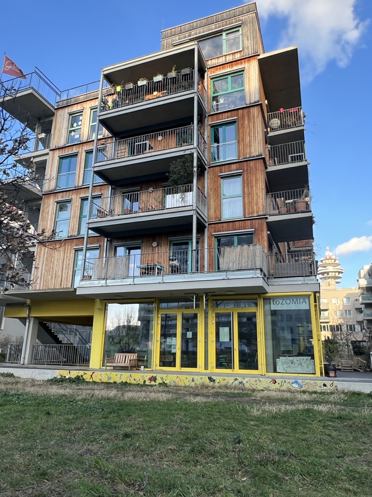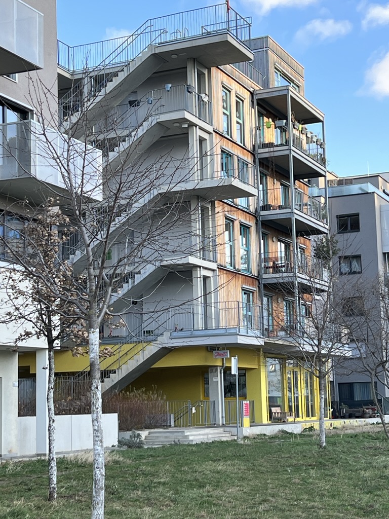 After this leisurely brunch we walked to the Karmeliter Market area — once the old Jewish section of Vienna— and now supposedly a hip area with some remaining traces of Jewish life. It’s a sweet neighborhood with a combination of commercial enterprises and Wilhelmian buildings. We then headed by public transit (we’re real pros now on the system) to see a wide range of social housing throughout the city.