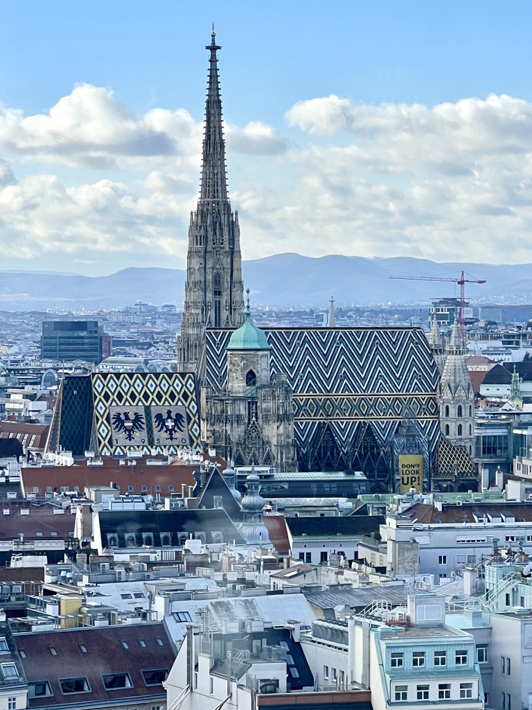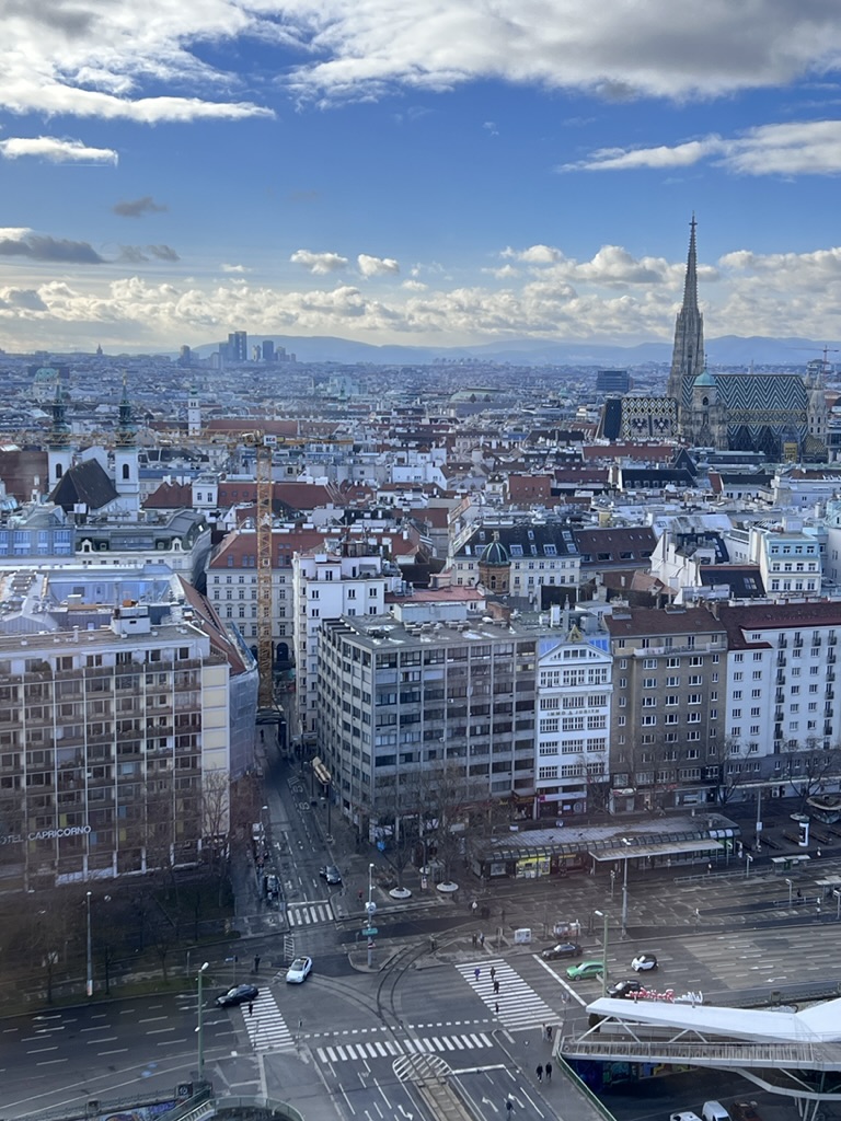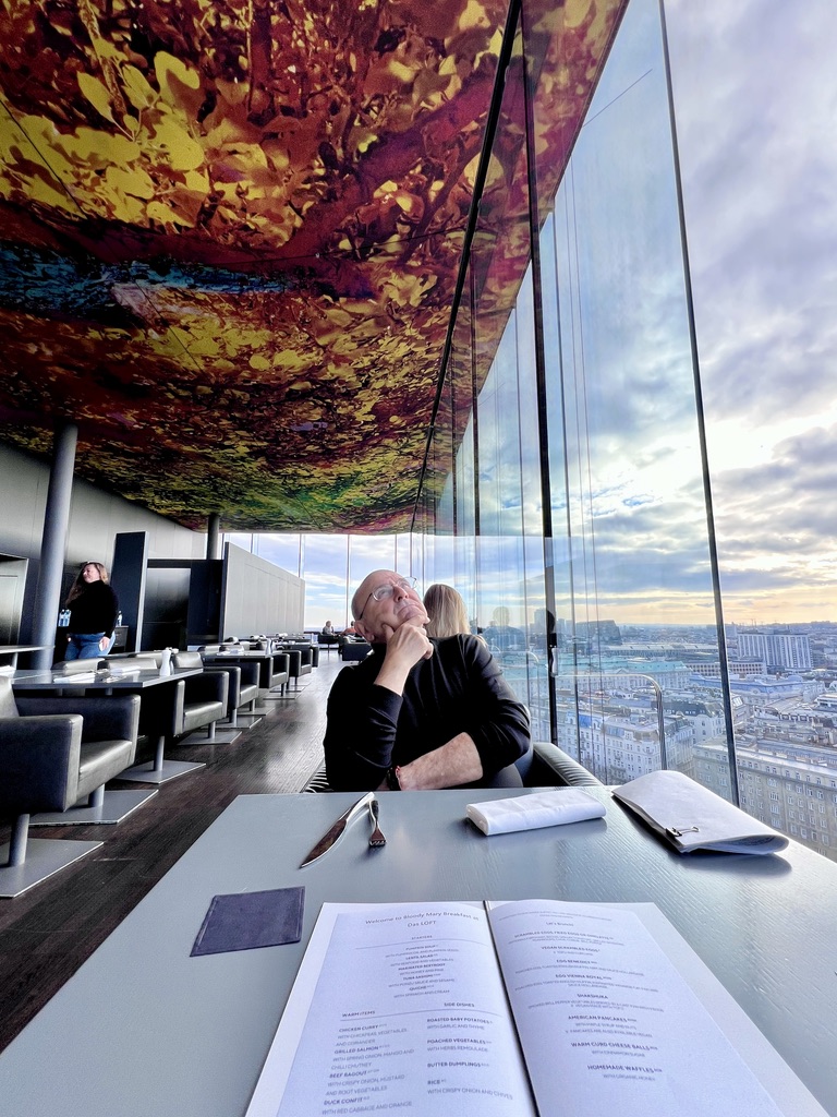 We headed out this morning to have New Years Day Brunch at Das Loft which is on the 18th floor of the SO Hotel which is located on the other side of the Danube from where we are staying. The building was apparently an old Sofitel Hotel and then about two years ago got a big facelift from French architect Jean Nouvel and it has been rebranded as SO. While the special New Years Brunch was quite wonderful, the obvious star of the morning is the spectacular views from the restaurant and the interior as well. Since Mike now seems back to normal, we started the new year off with bloody marys.. (sp).