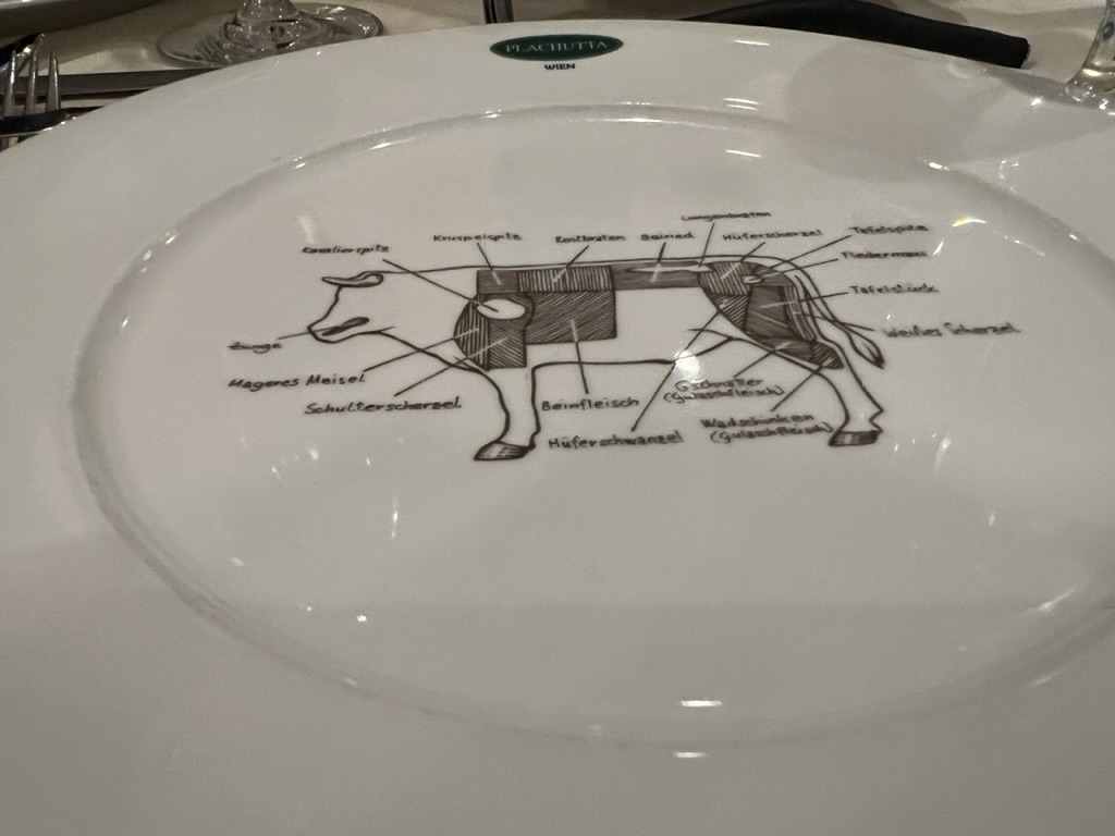 Eventually we headed back to the hotel (more trains and trams) and once at the hotel began to pack. Then we headed to Plachutta for dinner—which is about a 7-minute train ride from the hotel. It’s a family-owned restaurant that focuses on the Viennese tradition of “tafelspitz” which is a dish that has been popular in Vienna since the 19th Century and was a favorite of Emperor Francis Joseph who led a very frugal lifestyle. He preferred simple but tasteful food. Tafelspitz is a lean cut of beef that boils in a savory vegetable broth. Apparently, it is the quality of the beef that makes the difference. But there are many different cuts of meat to choose from at Plachutta.