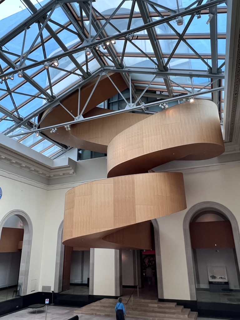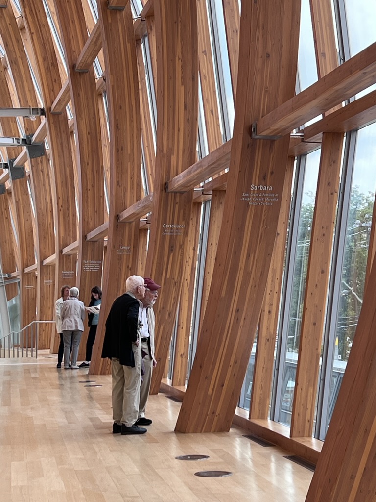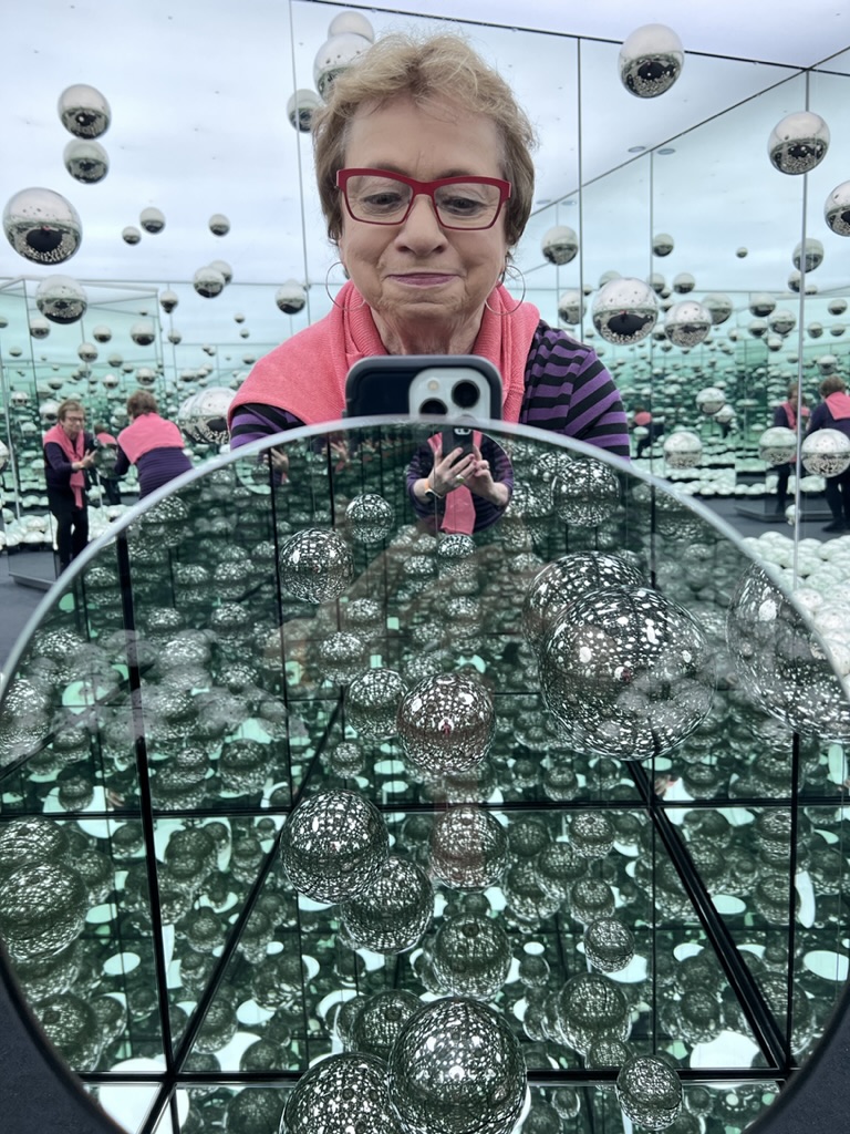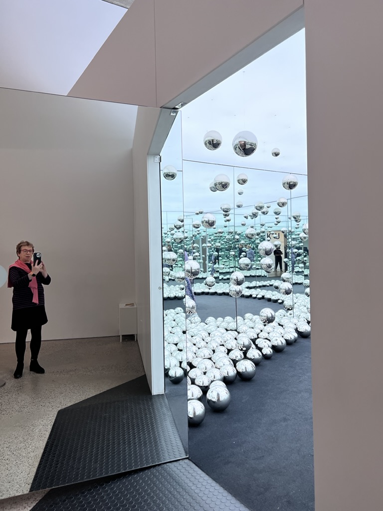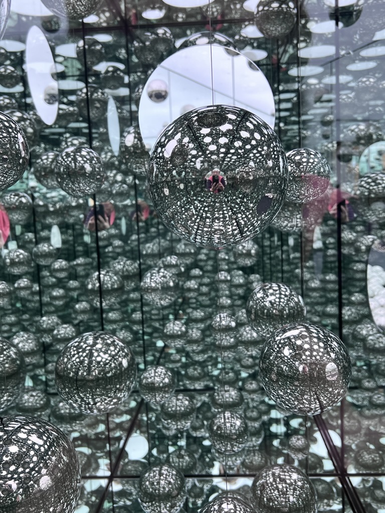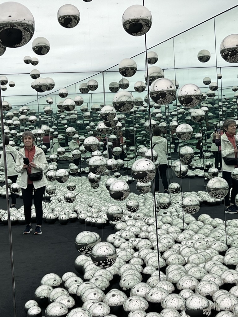 Set out today for very early lunch (sort of brunch) at the Art Gallery of Ontario, which was quite yummy… simple soups and salads. And then we headed to see the museum which turns out to be quite wonderful (this said by someone who wouldn’t go into a museum for 20 years, and still is hesitant about the commodification of artworks and how museums contribute to value that does not get passed on to the makers). But “AGO,” as it is called (Art Gallery of Ontario–get it?), is a very manageable museum… small enough to see a good deal in one visit and complex enough and with many temporary shows to be able to make return visits. Architecturally, it’s warm with a lot of beautiful wood walls. Moreover, they have a great collection of Canadian and Inuit art as well as the works of other native groups. Additionally, they currently have one installation by Yayoi Kusama, the Japanese artist who is sometimes called the “princess of polka dots” and who is famous for the reflective “balls” and mirrored infinity rooms that are always fun to experience. You only get one minute in the room (totally timed and they are strict about it), so I went in twice!