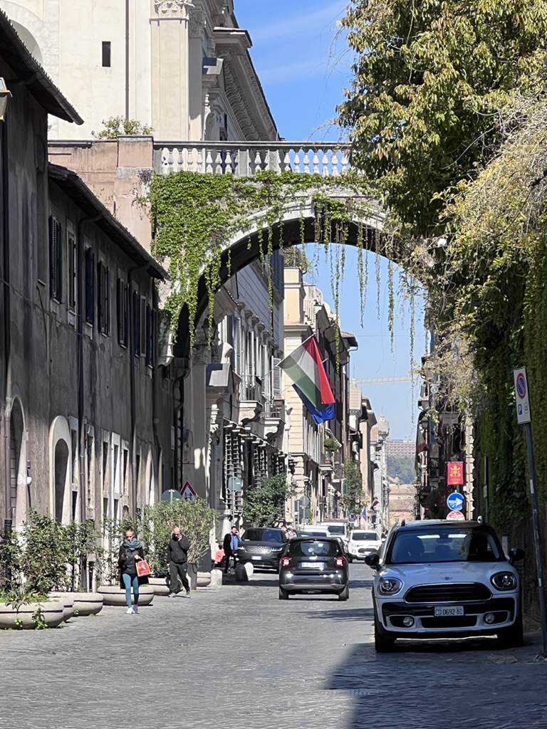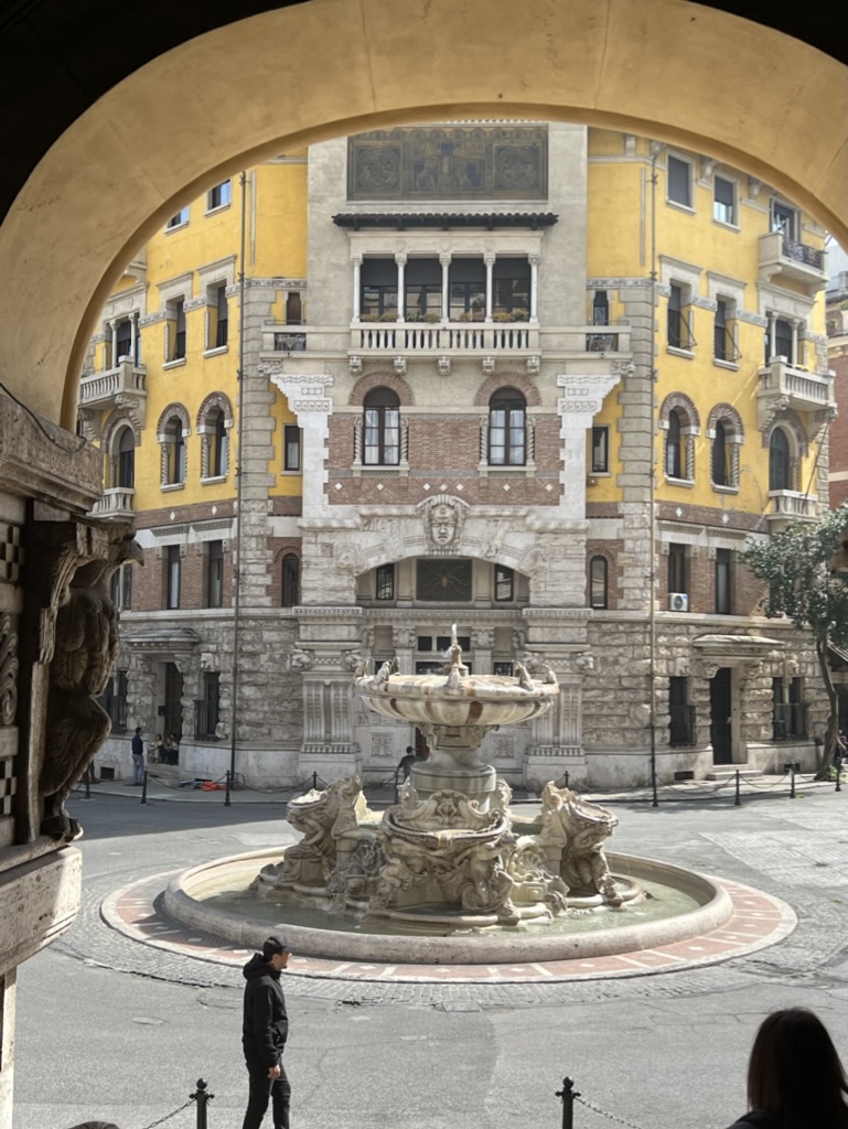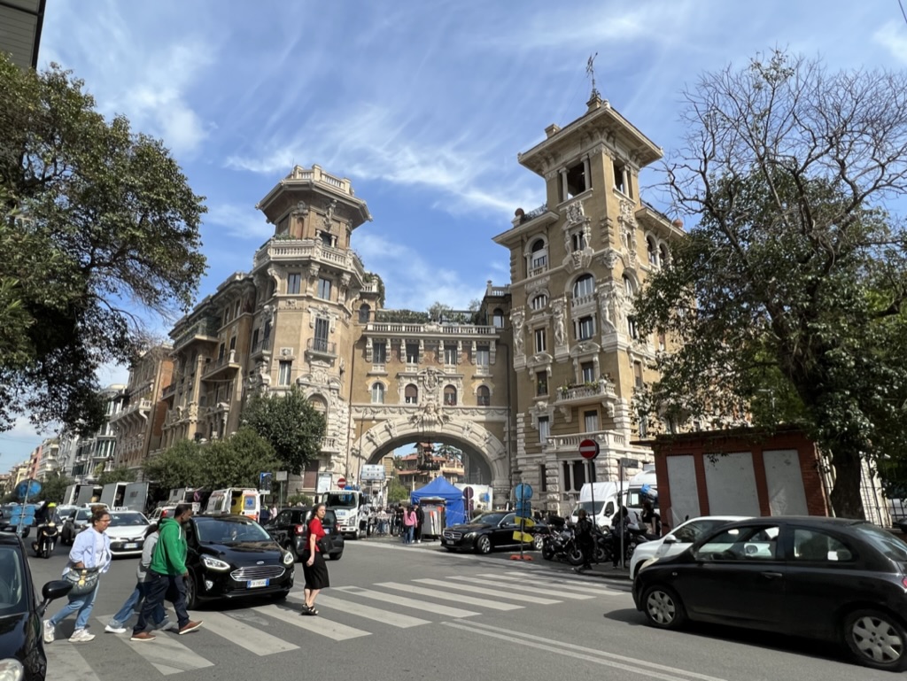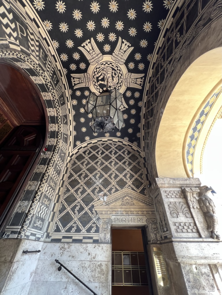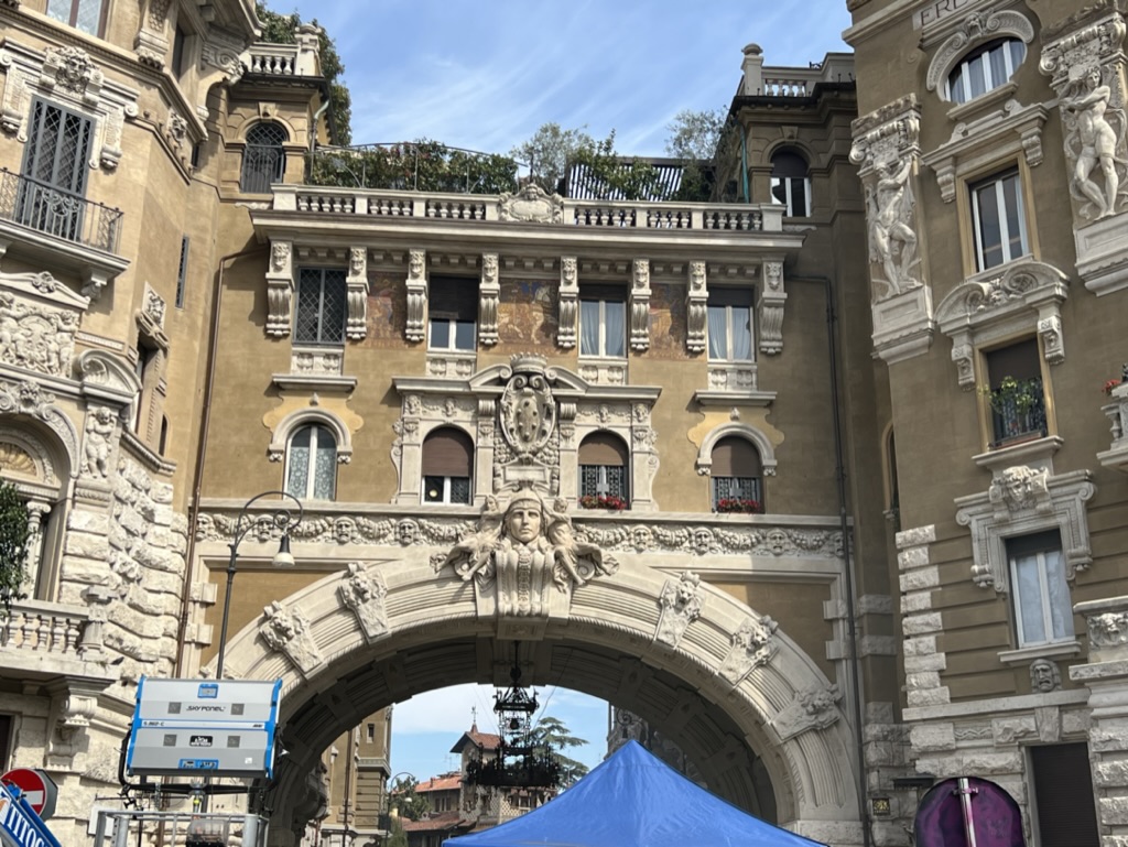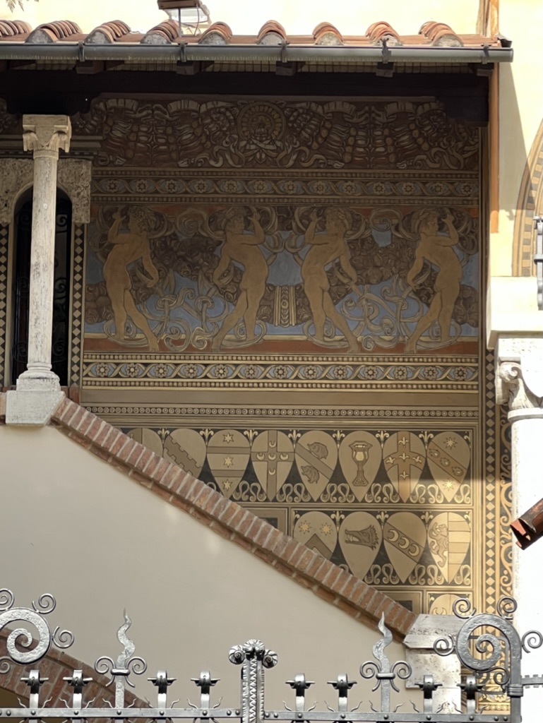 Then we walked (hiked) about three miles to get to Coppede, a neighborhood we had never seen on other trips to Rome. It was pretty much an uphill walk (didn’t’t realize that at the onset) but we persevered except for a short stop at a little outdoor Lebanese café to have some cold mezze. Finally we arrived in Coppede, excited to see all these amazing examples of Art Nouveau, Liberty, Art Decò buildings (residences) that seem to have also been influenced by Greek, Gothic, Baroque, and maybe even medieval art. The story that is told is that this neighborhood was the brainchild of an architect (I think from Florence) named Gino Coppedè who designed this neighborhood and oversaw the construction between 1913-1927. It’s an eclectic mixture of all of these historic styles and amazing ironwork. It’s been said that Coppedè is Rome’s answer to Gaudì ‘s Barcelona structures… although I don’t think I’d agree. The area is totally residential except for a few embassies, and not really easy to get to except on foot although there are some trams that can get you there.