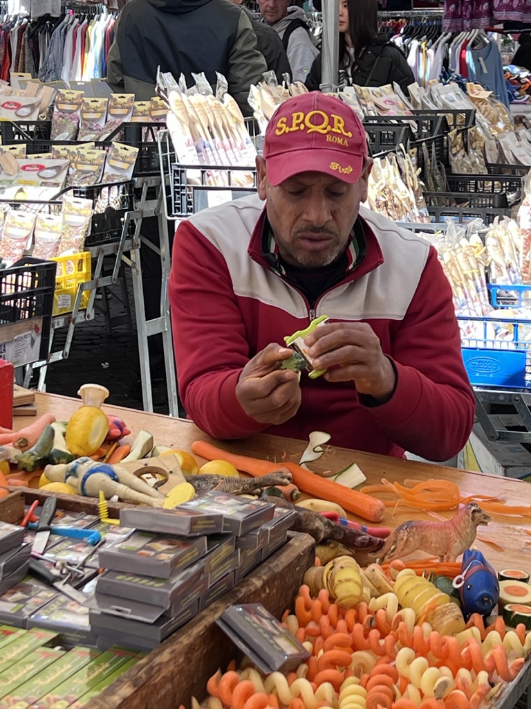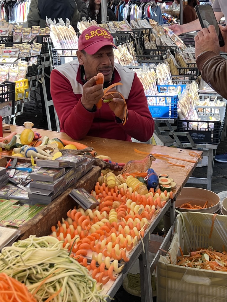 From there we walked to the Campo Fiore market which was abuzz with locals getting fruits, vegetables, herbs and other daily goods. It’s the oldest market in Rome, and every morning, (maybe not on Sundays), the square is filled with stalls selling fruit, vegetables, meat, poultry and fresh fish, and assorted clothing and accessories as well as “kitchen necessities” like things that curl carrots and make zuchinni into little rosettes. Other stalls have dried fruit, nuts and spices, and florist stalls surround the fountain located in the center of the square. Specialties that can be found at the market include the amazing Roman artichokes, which has already become a daily staple for me. Surrounding the market and on adjacent streets are delicatessens and bakeries. Along the walk we passed hordes of people lining up to see the Pantheon and Trevi Fountain… Glad we had seen those places many years ago when the lines were quite smaller and glad we agreed not to revisit.