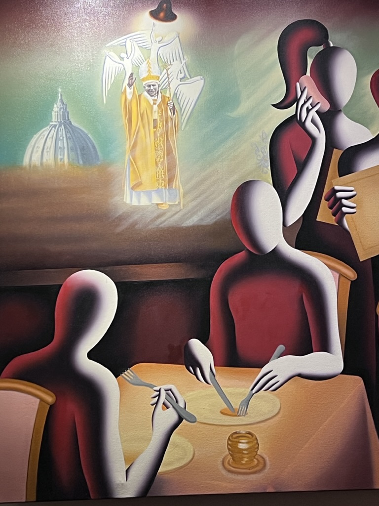 After a brief stop at our hotel, we headed down the street to Antica Pesa which is a well known restaurant more than a century old yet still maintains its quality and manages to keep up with the times. The entryway of the restaurant is filled –floor to ceiling— with framed photos of famous people who have eaten at the restaurant: Sean Penn, Robert Di Niro, Danny DeVito, Madonna, Sophia Loren, and Picasso, and the like. Rumor has it that there is a sister restaurant with the same name in Brooklyn. Will have to check that out on my next trip to NY. We started with artichoke (naturally).. this time done with some kind of mint sauce; a baccalau with cod cappuccino, potatoes whipped into a cream, and some kind of almond mousse, spaghetti carbonnara, and a honey pork with chicory. All very good.
