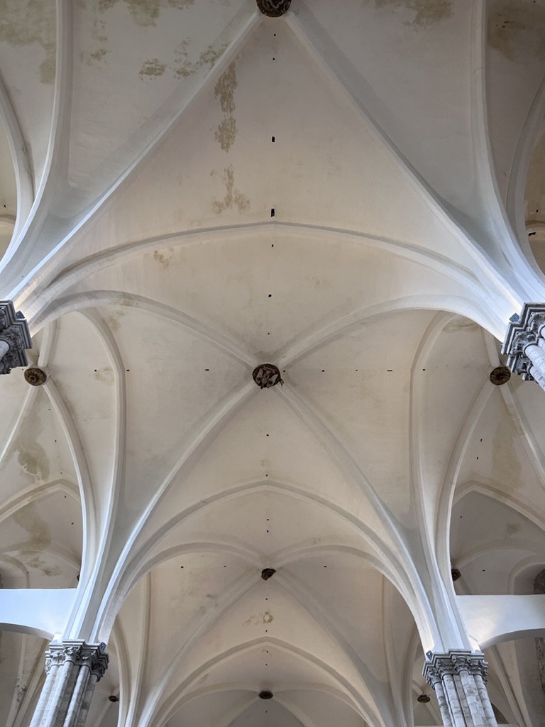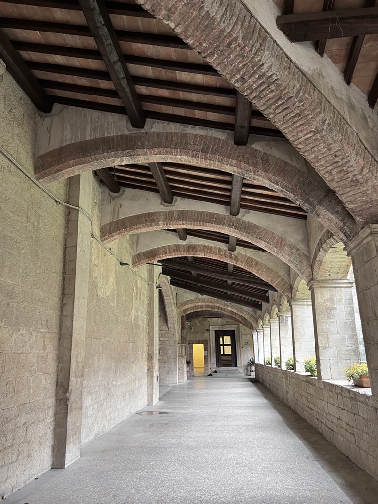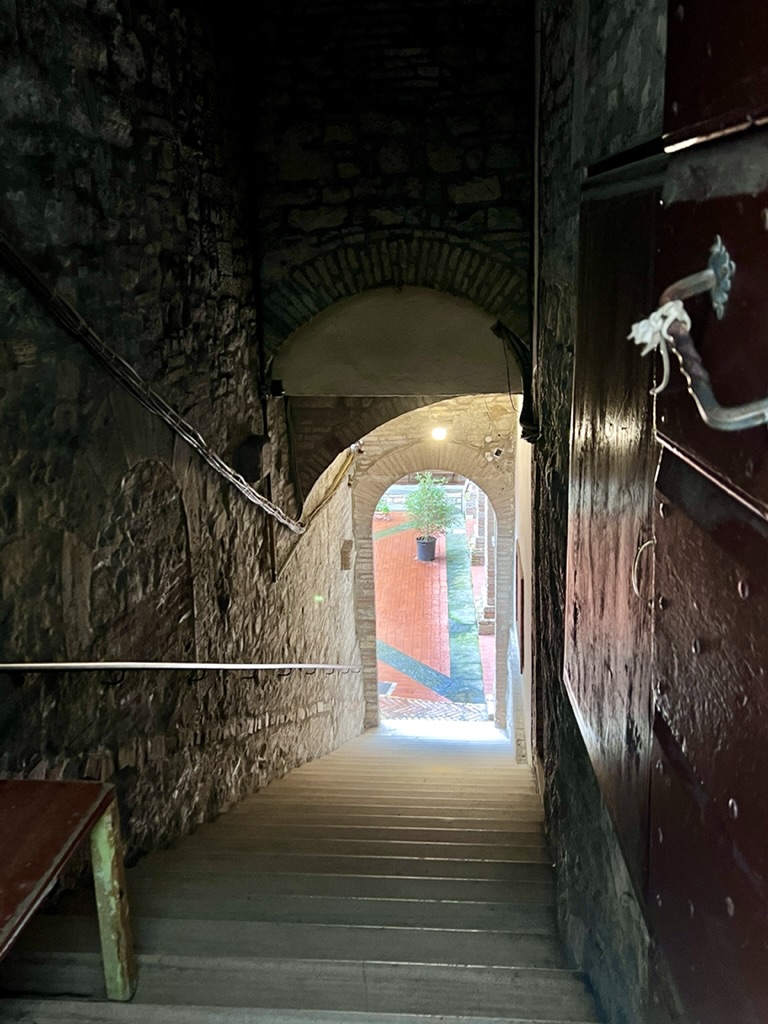 Todi is perched on a two-crested hill overlooking the Tiber River and has great views in all directions (which are a bit obscured for us due to the cloud cover and intermittent rain). It sits at an elevation of nearly 1,500 feet and has a population of 17,000 (about the size of Albany, California). Legend has it that the city was built by Hercules in 1330 BCE. In the 12th Century CE it had 40,000 inhabitants. It’s located in the Umbria region, and was historically a defensive stronghold for the region. It has an exterior medieval wall and a more inner Roman wall, and the most inner wall is said to be Etruscan.