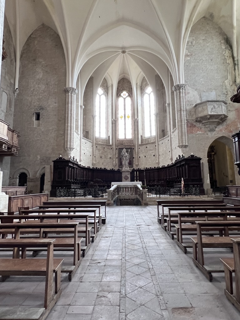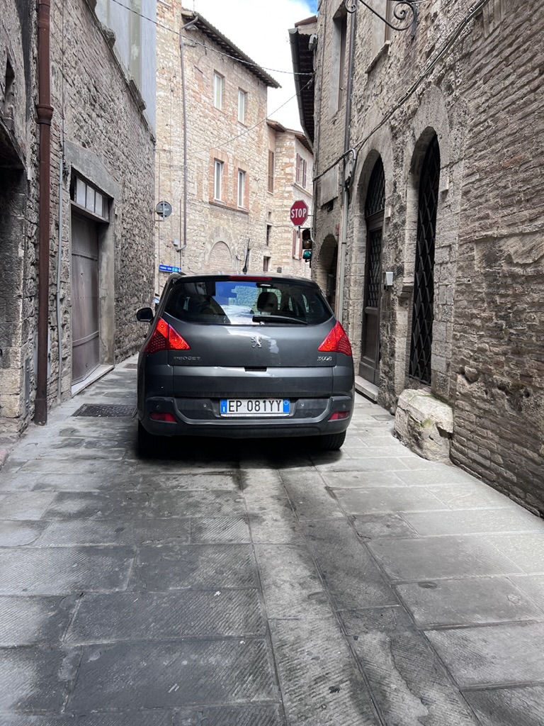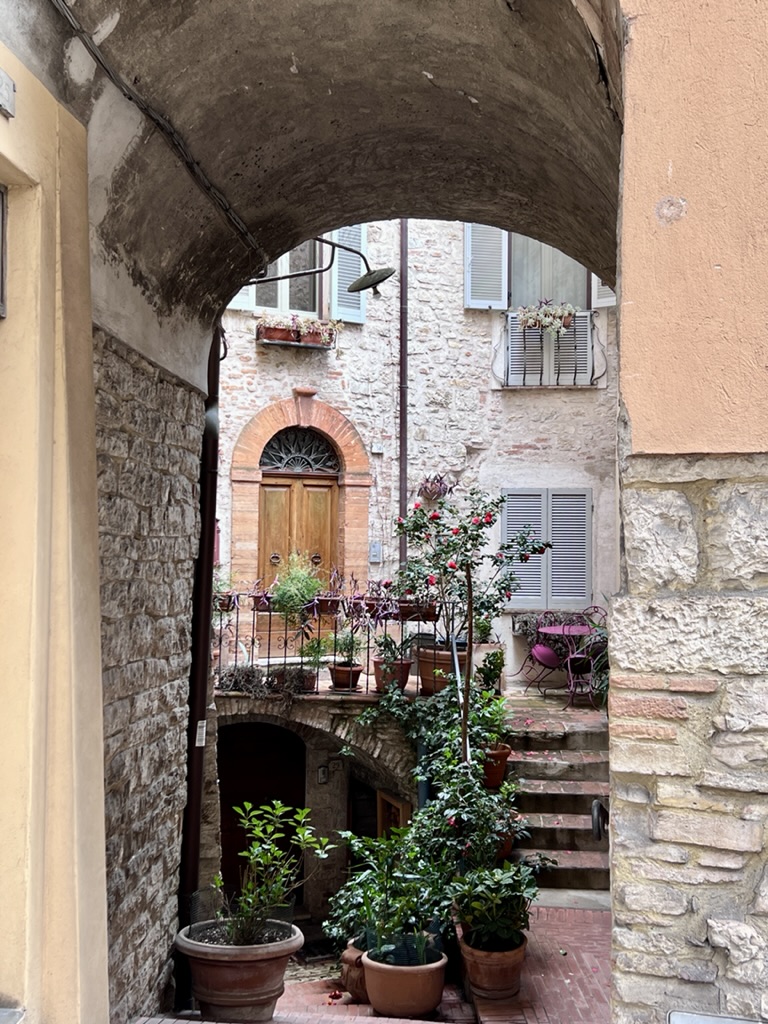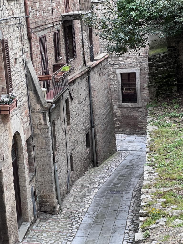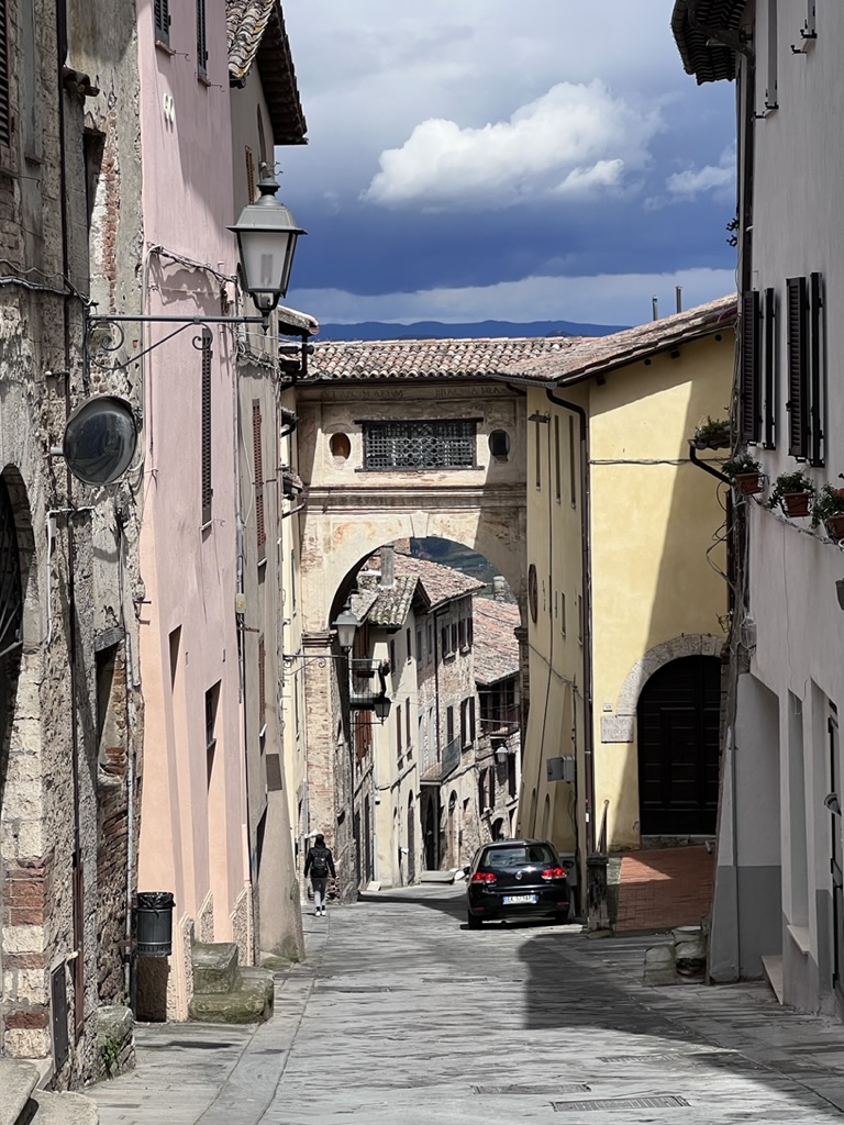 Then we did some serious walking and climbing in an effort to both see the town and also to walk off some calories. Stopped in a few churches, but mostly just took in the beauty of the town and marveled at its condition. And despite the narrow steep streeets, cars seem to meander well and deal with blending in as cars come from the other direction to share the narrow road, by backing up or waiting as one car finds a slightly wider section of the road. Most streets are one way and they loop around the town. We came back to the house for a short time to put on heavier clothes; it’s been chilly here in Todi and without sun it feels even colder.
