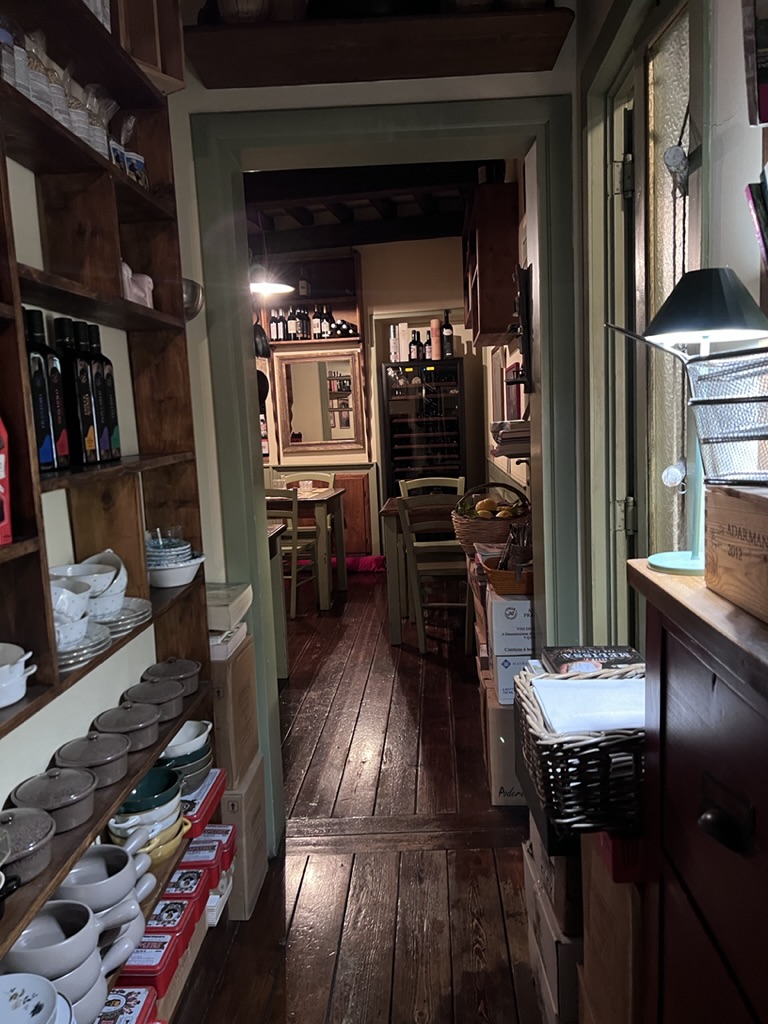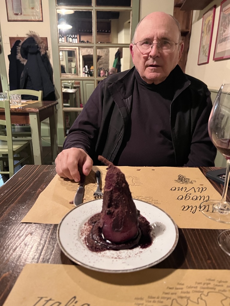 And then we trekked uphill again for dinner at Enoteca Oberdan— a very tiny bar with a teeny backroom that has about 8 tables for two. The chef/owner, whom we met because she spoke some English, grew up in Rome and moved to Todi in 2006. We had a fantastic meal from the daily handwritten menu that is presented on a brown paper bag: a dish with ricotta, artichoke, and mint followed by short pieces of one-inch diameter pasta tubes with tomatoes and pistachios (and I’m sure many other ingredients), followed by a wonderful dish of very tender beef that has been cooked with tomatoes, chopped red peppers, and herbs and I think enoki mushrooms. And ofcourse some local wine which is really good, and yes, the poached pear for dessert (can’t help it). After dinner, we strolled back to the palazzo… this time the walk was all downhill and quite pleasant (but could have used another layer of clothing).