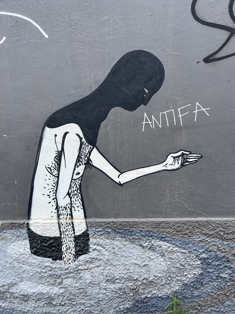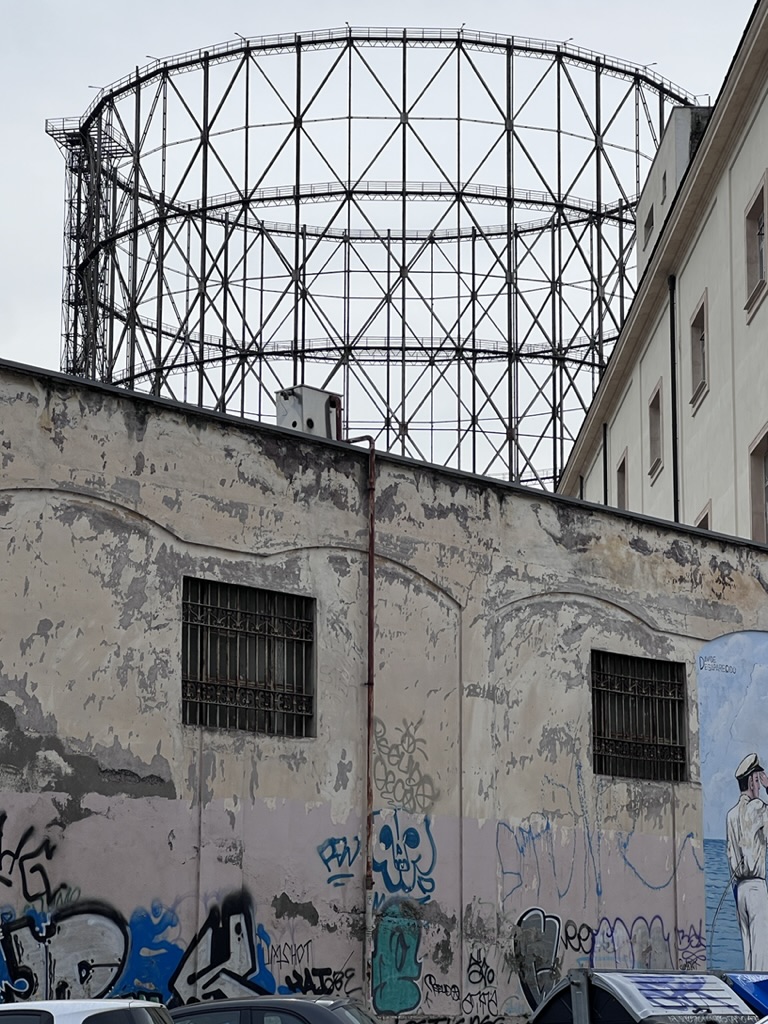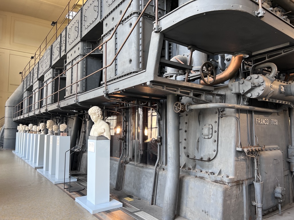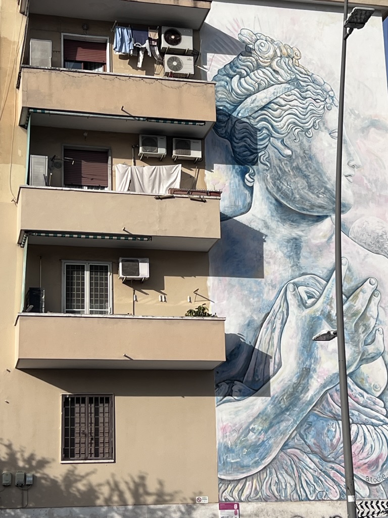 Then we walked to the Ostensiense neighborhood which is known for having a lot of murals and graffitti. It, too, was a former working class area and is now borderline chic. The neighborhood was the location for a lot of Rome’s industry and there were major power plants in the area as well. One of those power plants has been turned into a museum, which I am certain the designers and curators had a lot of fun creating. Much of the original machinery remains (now painted black) and all sorts of white marble sculptures (figures) uncovered throughout Rome from the Renaissance and Baroque eras, stand in front of the machinery—great contrast. The “museum” is called the Centrale Montemartini. We loved it—the contrast (and similarity?) between the machines and the sculptures was great: both beautiful and requiring a good deal of artistry. Nearly all of the male statues were missing their penises (broken off) … not sure what that’s about, but I’m sure one can do some research and find some academic who has studied this issue.