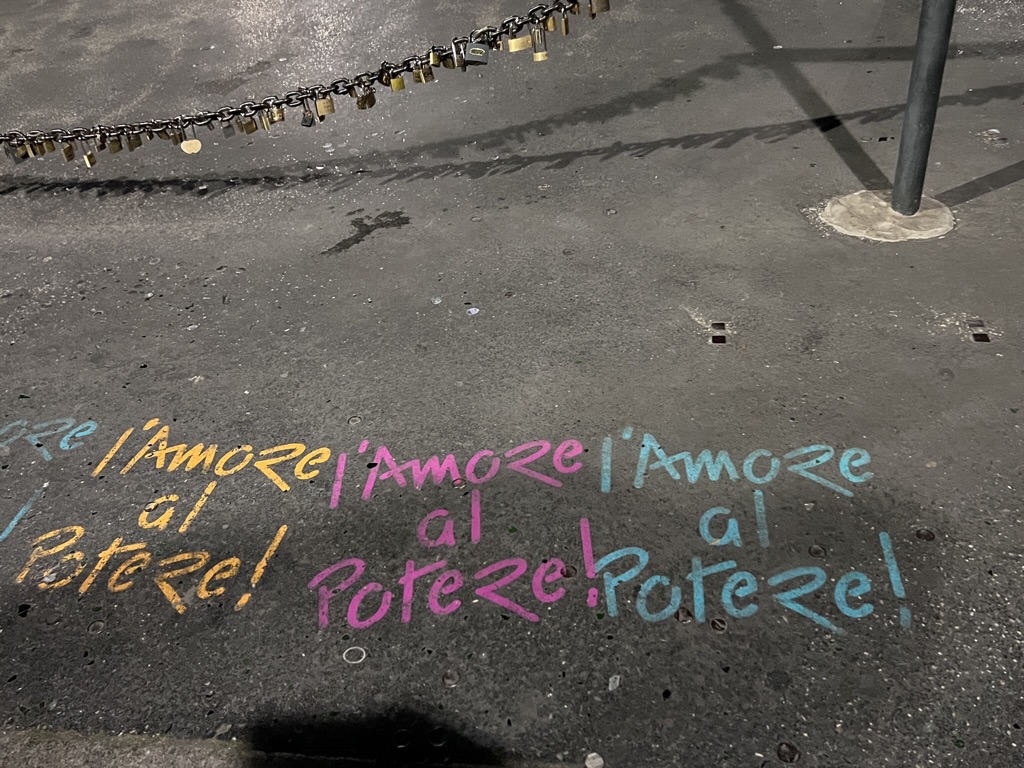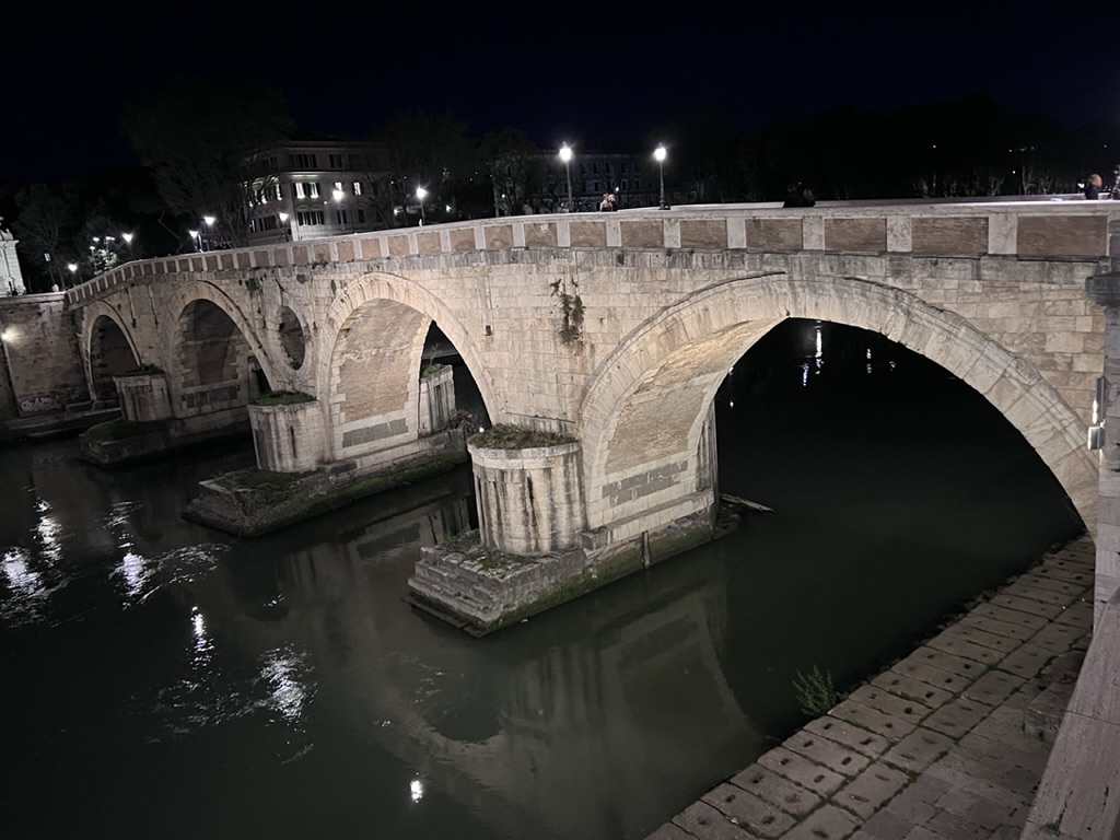 For dinner we headed to Rosciolo which is across the Tiber… and we saw the area we had been walking in all day, at night. By the way, the walking bridge closest to our hotel has hundreds (maybe more) of little locks (suitcase locks? Bicycle locks?) stretching across the entry to the bridge – placed supposedly by young (and old) lovers who carve their names in the locks and then place the lock on the chain and throw away the key. This is probably a copy of what was done on one of the bridges leading to the Île de la Cité in Paris, where all of the locks needed to be removed because the bridge was collapsing since it was not structurally sound enough to handle the weight of over 700,000 locks that had been installed by couples.