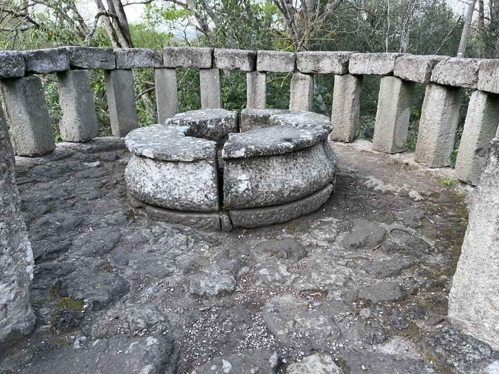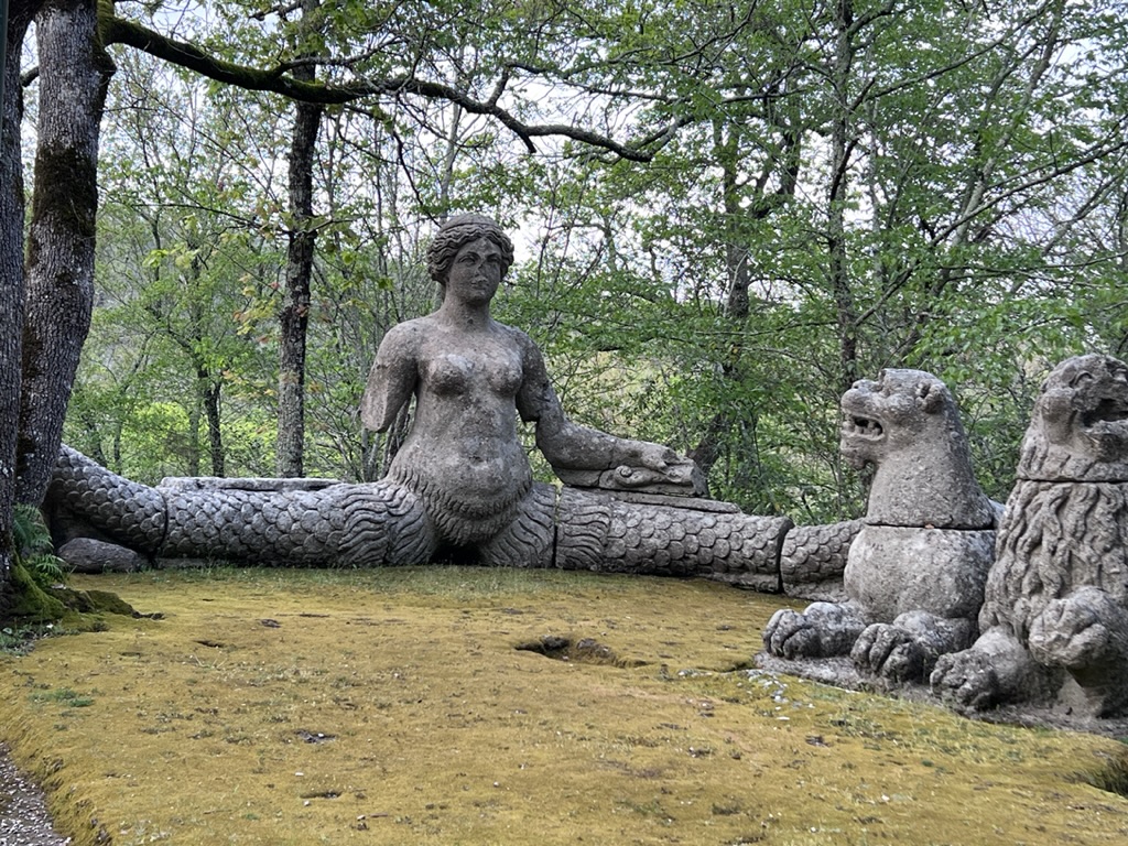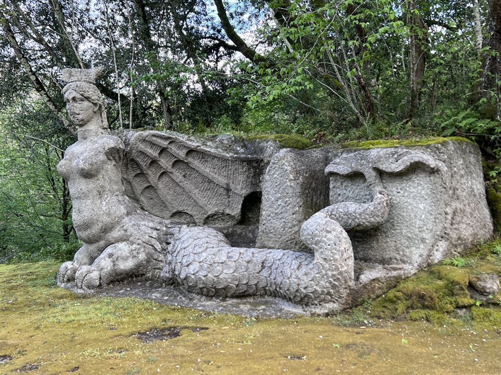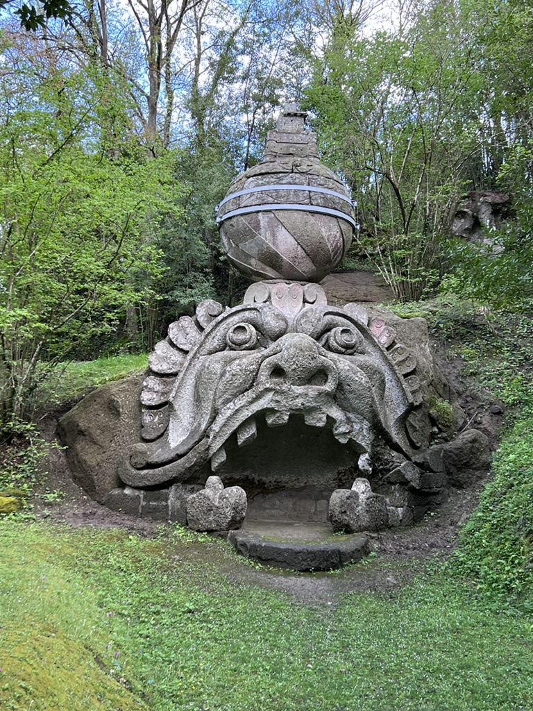 Then we headed to Bomarzo, the site of a very strange park—made even stranger by the cloud cover and slight damp ground. It’s called The Monsters’ Park of Bomarzo… with numerous larger-than-life sculptures.. and was created in the middle of the 16th Century by Vicino Orsini who had an estate on that site. He built a labyrinth of symbols where “Ladies and Knights could look to have their wishes fulfilled and wander until they got lost” (this comes from the brochure at the park). “He populated the ‘sacred wood’ with monsters and tortoises, obelisks, nymphs, and giant statues.” After his death, the place was abandoned, and no one cared for the structures—considered (again according to the catalogue) to be “jewels of mannerist art.” But after centuries of oblivion, the present owner–the Bettini family brought it back to life. According to Wikipedia, it was commissioned by Pier Francesco Orsini, called Vicino, a 16th-century patron of the arts, greatly devoted to his wife Giulia Farnese (not to be confused with her maternal great-aunt also named Giulia Farnese, the mistress of Pope Alexander VI). When Orsini’s wife died, he created the gardens to cope with his grief. During the 19th century, and deep into the 20th, the garden became overgrown and neglected, but after Salvador Dalí made a short movie about the park and completed a painting based on the park in the 1950s, the Bettini family implemented a plan to restore the park; the restoration project lasted throughout the 1970s.”