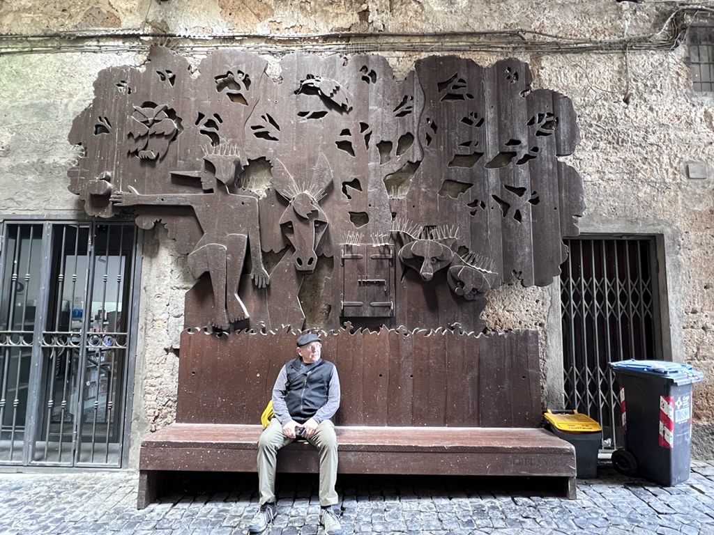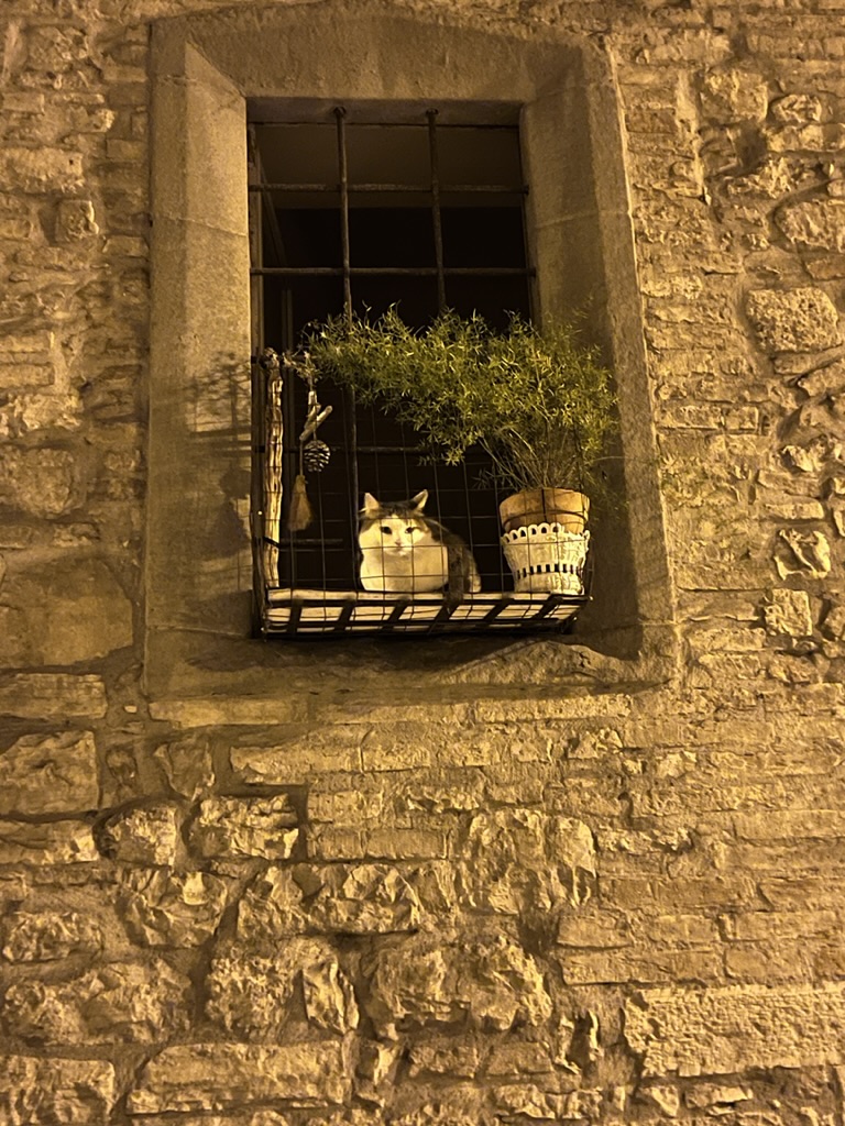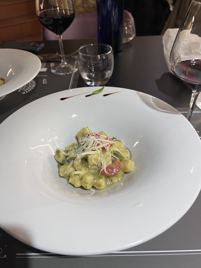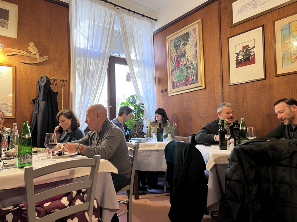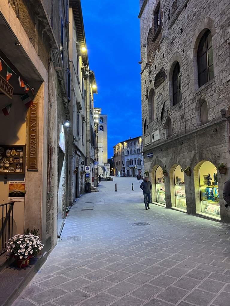 We decided to save time and head back to Cavour which is a quick walk up to the square and off a small alley (close but steep). By the way, we’re averaging well over 12,000 steps and 8 flights a day which does not account for the steep pathways. (But alas, I think we are adding pounds rather than losing, given the amazing meals). We had had lunch at Cavour the first day we were in Todi, and the food was good; it was comfortable and not fussy. They were pretty crowded (unlike the lunch the other day) and we finally got a table in the downstairs stone-walled room, as opposed to the light-filled upper room with great views. As it turned out, there was a table of about 14, including 4 couples and their combined six children—all appearing to be under the age of 6. They were there before us and outlasted us, when we left at close to midnight. So, we watched family life in Italy up close. Not to generalize, but…. The four men (all in their early 40s I’d guess) sat together at one end of the table conversing about who knows what (soccer?) oblivious to the rest of their table which was comprised of their wives/partners and their children. The women, the moms, were totally occupied with the kids who were very very loud and running around the restaurant. The moms barely ate as they tried to make some kind of order (without success), but the dads continued their conversation, eating, drinking, laughing, eating, so casually that you would think they were a separate party from the rest of their group. Indeed, the men had about two chairs that separated them from the women and the kids. We thought we might have some peace by the time we got our dessert but no such luck as the men (the dads) lingered over coffees, desserts, and after dinner drinks… while the women and the children were at the other end of the table, ready to leave with jackets already on. Not generalizing, but maybe the macho culture really still does exist –even among the 40-something group…. In Italy?? Oh the meal… food was fine, but could not compensate for the chaos… oh.. what did we eat: a very nice steak tartare with sprinkling of pistachio dust and good spices, leg of lamb with roman artichoke…
