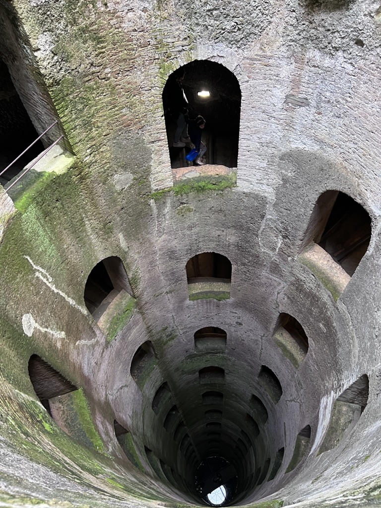 Then we went to St Patrick’s Well… The Pozzo di San Patrizio … a historic well designed and built between 1527 and 1537, by the architect/engineer Antonio da Sangallo the Younger of Florence, at the behest of the Pope at that time who had taken refuge at Orvieto during what is known as “the sack of Rome.” It was feared that the city’s water supply would be insufficient in the event of a siege. The name came from medieval legends that proclaimed that St. Patrick’s Purgatory in Ireland gave access down to Purgatory and that was defined as something very very deep. The well shaft is designed with two ramps that are like a double helix, with only two doors – one leading to the down ramp and one the up side, which enabled mules to carry empty water containers down and full containers up without obstruction. The well is 175 ft. deep and 43 ft. wide. There is a large dome over the well that provides light. A Latin inscription says “QUOD NATURA MUNIMENTO INVIDERAT INDUSTRIA ADIECIT” which Google translates as “Industry added what nature envied to the fort.” Mike, with his high school Latin translates it to say “What nature has provided, industry has enhanced.” Anyway, we started to descend to the base of the well, but quickly decided to just go a few landings and turn around (even though technically we should have gone to the bottom and then up the other side as planned, since if you reverse your route, you cannot exit at the entrance… but we cleverly waited for someone to enter so we could sneak through the door. The steps were very uneven; it was dark; because of recent rain, the steps were slippery; and the steps were very uneven. We decided we got the sense of the well by looking down and across. It would have been exciting, I suppose, to do the 527 steps.. but not slipping or falling was also a good idea.