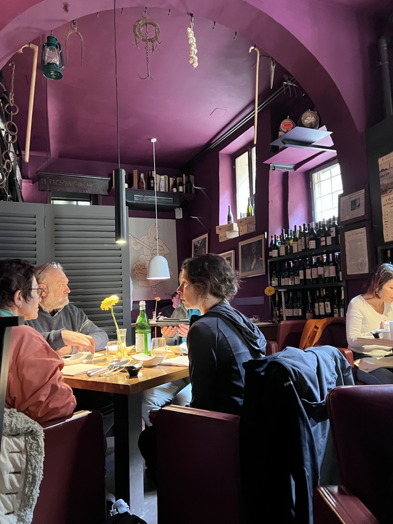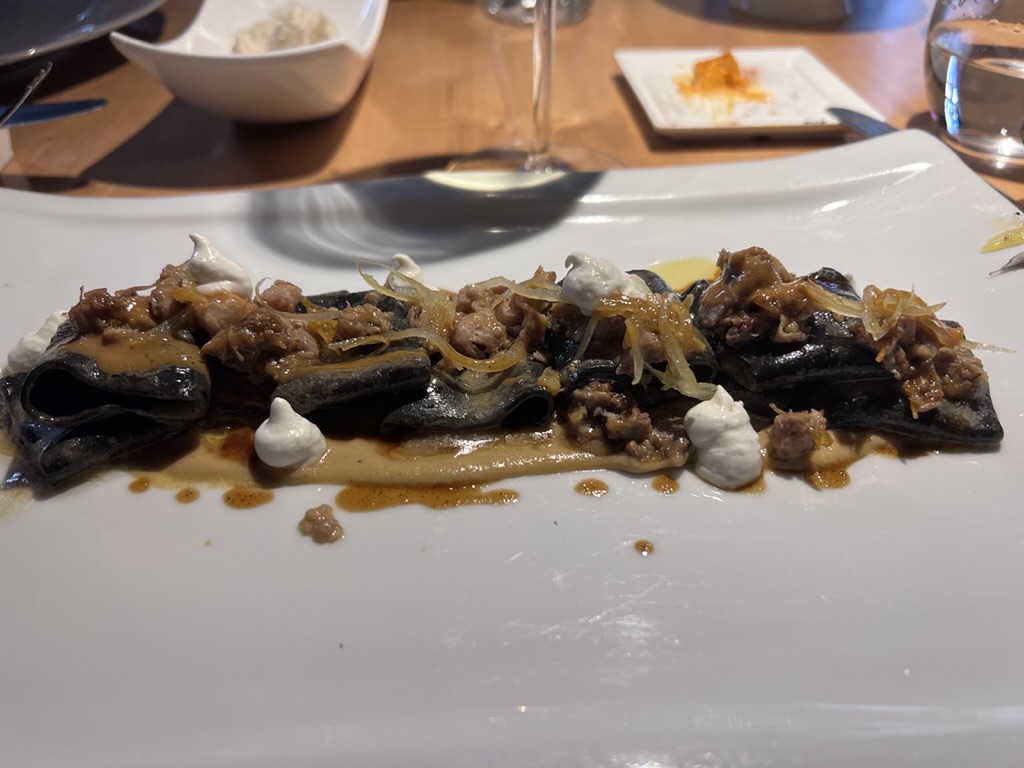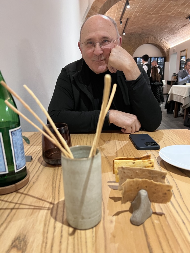 We had made reservations for dinner at Campo Cerdo; can’t remember where we got the reference. It’s only about 500 meters from the hotel and the walk there was easy—all downhill. As we happily strode to the restaurant at about 9 pm, we almost forgot that this easy stroll would mean a rigorous uphill hike on the return trip. Campo Cedro (translates to Cedar Field) was a big surprise… in a good way. It’s hidden away from any major or even minor street and indeed GPS had a hard time finding it exactly and led us astray a bit. The restaurant is led by a Japanese chef who has been cooking in Italy for more than twenty years. Like the hotel, the restaurant is in a centuries-old building, but the inside is very modern, stark- white with wood finishings. The food was wonderful— very fresh with interesting combinations. Michelin says it’s “one of the most interesting gastronomic stops in Siena.” For the foodies, I wrote down what we ate, except for the tiny starters (which like the ones at L’Oficina) were too hard to remember and they were not listed on the menu. We shared one antipasti, one primi, and one segundi, and one dessert…