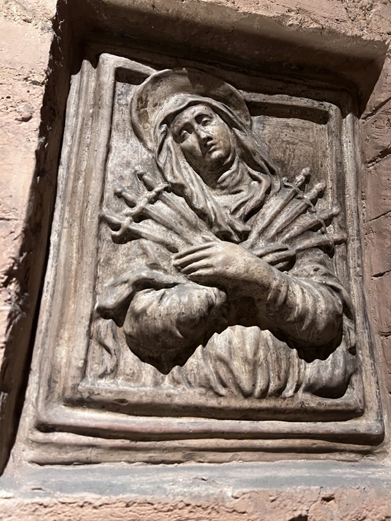Then we strolled back to the garage and we were off to Siena. Haven’t been to Siena in about 20 years (realizing now that all of our far more exotic travel has limited the amount of travel we’ve done in recent years to in Europe). The drive to Siena was fine, although Mike who is doing most of the driving was totally stressed out with cars speeding past at speeds well beyond the limit and a good deal of construction on the road, making the already narrow lanes even more narrow and eliminating lanes for much of the drive. When we got close to our hotel (Palazzetto Rosso), the GPS got a bit confused or perhaps the navigator (me) was confused so we wound up circling the medieval center at least twice before finding our way. Actually, we needed to go through an arch into the center, but there was a car blocking the very narrow entrance so we thought it was a restricted road and missed the turn. Anyway, we found our way to the hotel through streets where we were glad the car didn’t scrape the walls on either side. Dropped off our bags and went back outside the city walls to park the car… and take a series of six escalators back up to the center and almost to the hotel door.