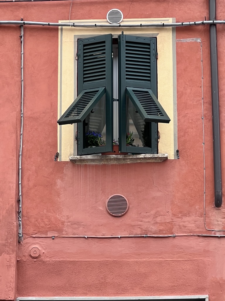 Palazzetto Rosso is located in the heart of the medieval center.. and has apparently hosted travelers since the Middle Ages, when traders from all over the world came to the Tuscany area to find work. The building is from the 13th century and retains the original facade (albeit very updated) complete with wrought iron signs. But, if those 13th century traders who stayed here could return, they’d be in shock. The hotel is a high design, elegant, tasteful, modern, and minimal statement. It has just nine rooms. We are on the top floor (third floor); the room is large including a sitting alcove and is furnished minimally with a glass desk, hip colors for accents (lime green and purple). There are Pedrali chairs and much of the furniture is by known high-end Italian designers. Given that we are on the top floor we have sloping beamed ceilings. But the architecture and shell of the building retain the old style with extremely high vaulted ceilings, frescoes, and arches. The floors are gray tiles and there are some pretty mod benches and light fixtures. It’s a good mix of the traditional Tuscan with modern design. Every room is different, we are told, and all contain some quirky combination of old and new… like painted friezes, beamed ceilings, Venetian drapes right next to modern design pieces. And we even have a large flat screen TV, so now—for better or worse— we can catch up on what’s been happening on the political scene. (or perhaps not). While we have a very modern bathroom, we were told that some rooms have sinks made from ancient fountains. We also have a glass wall between the shower and the bedroom so that you can see the view while taking a shower.