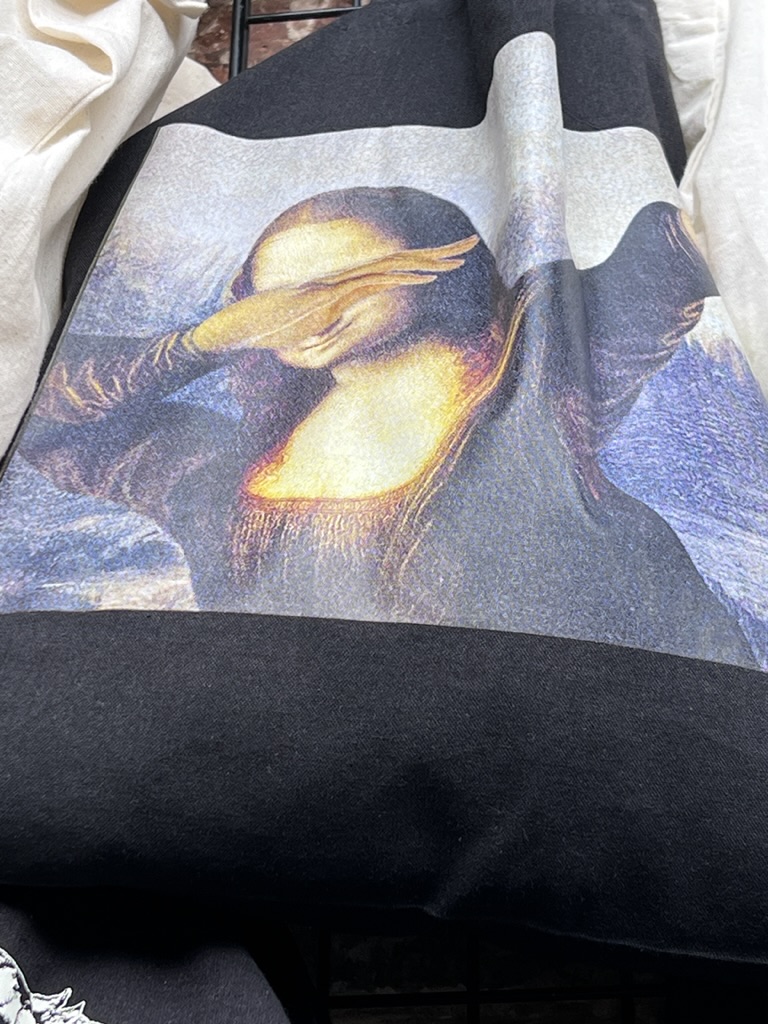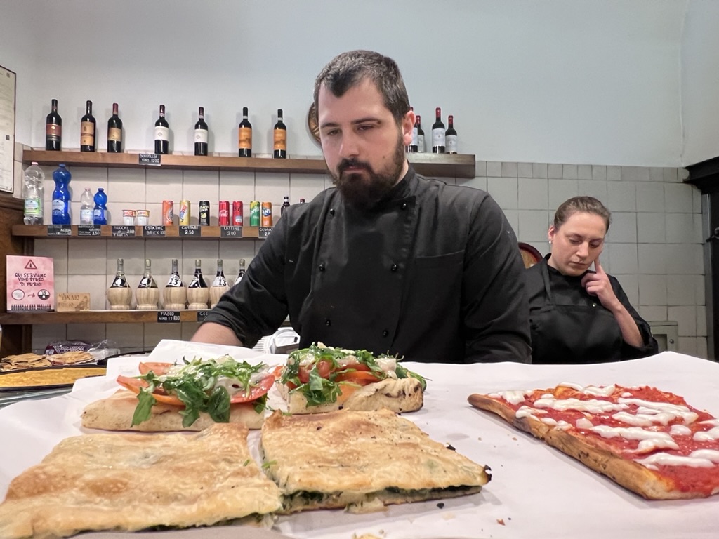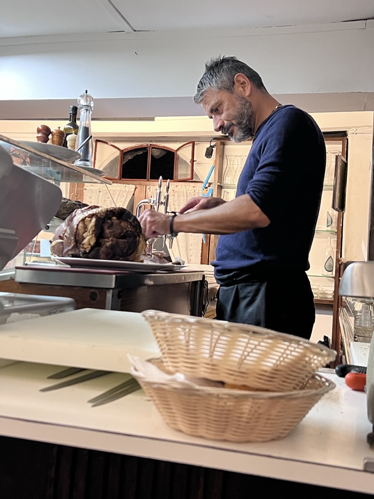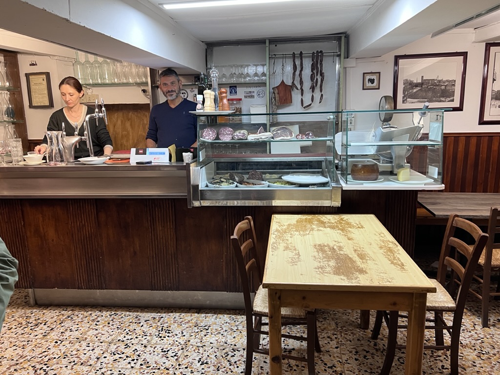 Then we took a long route back to the hotel and Mike decided to relax while I strolled for another hour or so, clocking in at 14,000 steps and six floors. Tonight, we ate at a tiny hole-in-the-wall place called Osteria il Grattacielo, where the owner (?)/chef prepares whatever he feels like cooking that day and that’s that. No menu. There are only about 5 tables inside and two tables outside. It’s on a somewhat hidden street under stone arches. The “chef” prepares an antipasti platter, three different kinds of pastas but the sauce is the same only the pasta shapes differ, and one main course, and biscotti and vin santo for dessert. He’s behind the counter all the time, but the restaurant is so small that he tells you what he’s offering and takes your order as well as prepares the food. There is a waitress—his wife– who delivers the food and clears the tables.