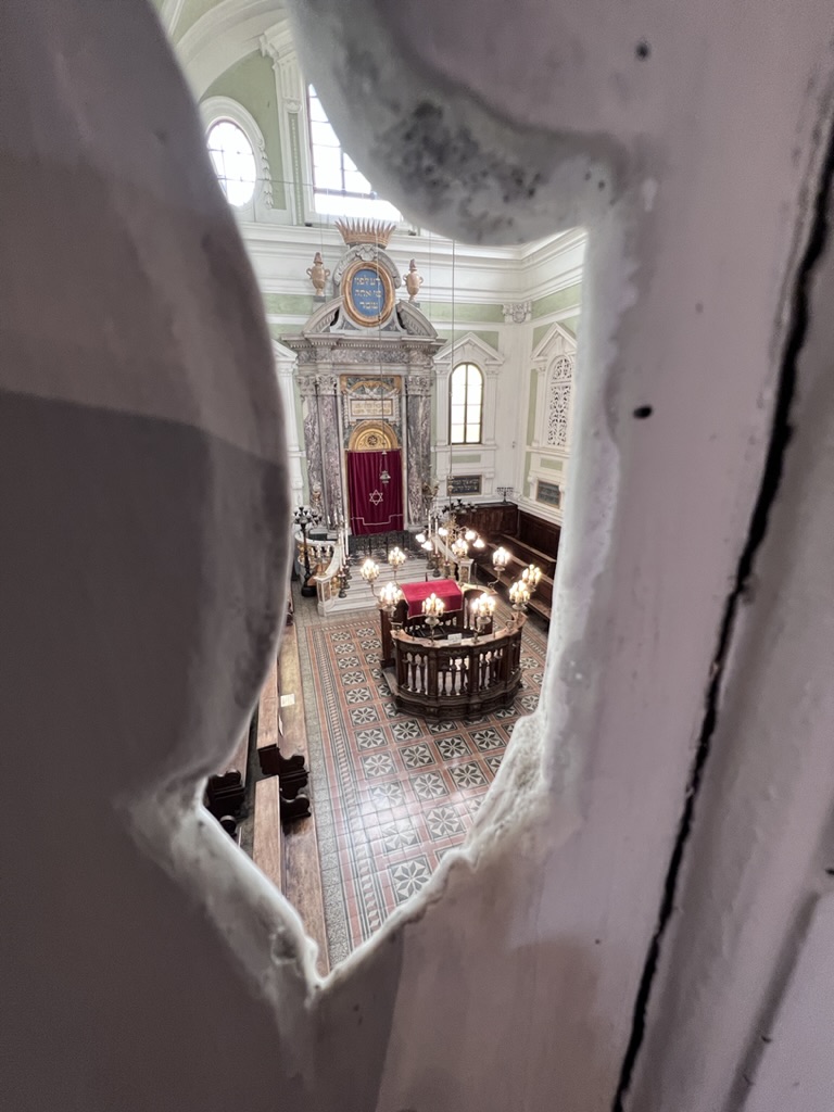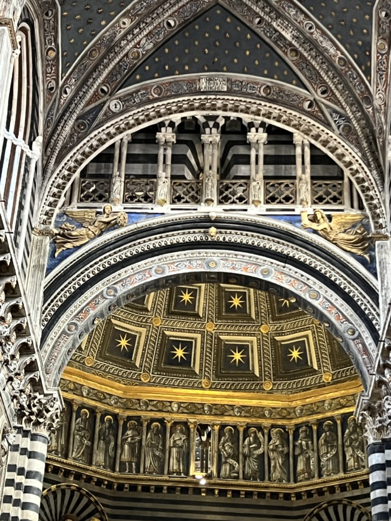Apparently, there was a sizeable Jewish community in Siena as early as the 14th Century. In 1571 Jews were restricted to a particular neighborhood -– the ghetto—-and so the synagogue was built in that area. It wasn’t until 1860 that Jews were able to move out of that area. Interesting to note, Jews were not allowed to build houses of worship that could be identified at street level. Thus, the façade is very plain and looks like a residential building. The sanctuary is sort of neoclassical and there is a baroque ceiling. The women’s section on the second floor overlooks the main sanctuary but is only seen through an elaborately carved wood screen (painted white). At the entry level of the synagogue there was a small exhibit of photographs of Jewish families with their husbands and sons who fought for Italy during World War I and who fought with the Partisans against Mussolini and the Fascists; many died in both wars.