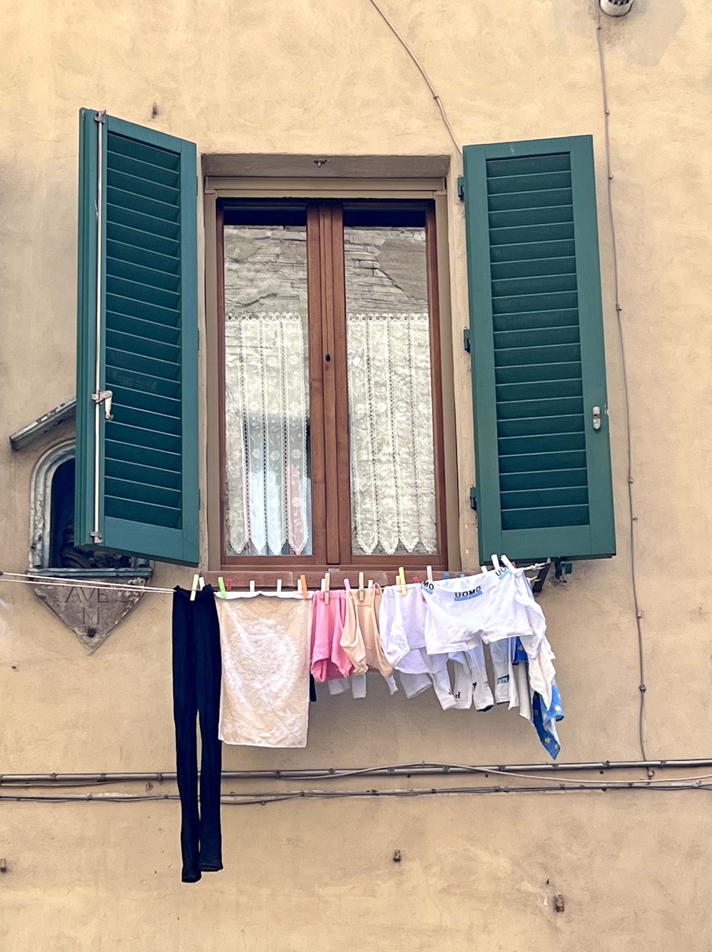 We then walked about a mile or so into a functioning neighborhood where people shop at small stores; where laundry hangs out windows; where people are walking and eating paninis; and where there are laundromats and little food shops. We strolled and strolled and eventually stopped at a little pizza place where we sat at a counter, ordered three different kinds of very large pizza slices that we shared and two glasses of local wine (the pours were huge—probably 8 ounces each). Our bill for all of this was about $12.00. We laughed at the amount of wine since last night at Campo Cedro we got about 4 ounces at most in a glass (thus requiring many glasses). We then stumbled upon the city’s old synagogue and went inside. It was quite a contrast to the Duomo where every inch of space is covered with frescoes and bas reliefs and decoration of some sort. The synagogue, like all synagogues, was devoid of imagery and decoration. We saw the main sanctuary and the “women’s section.” And then we continued our walk—enjoying Sienna in the sunshine. (Yes, the sun shined today, which was wonderful, although it is still cold.
