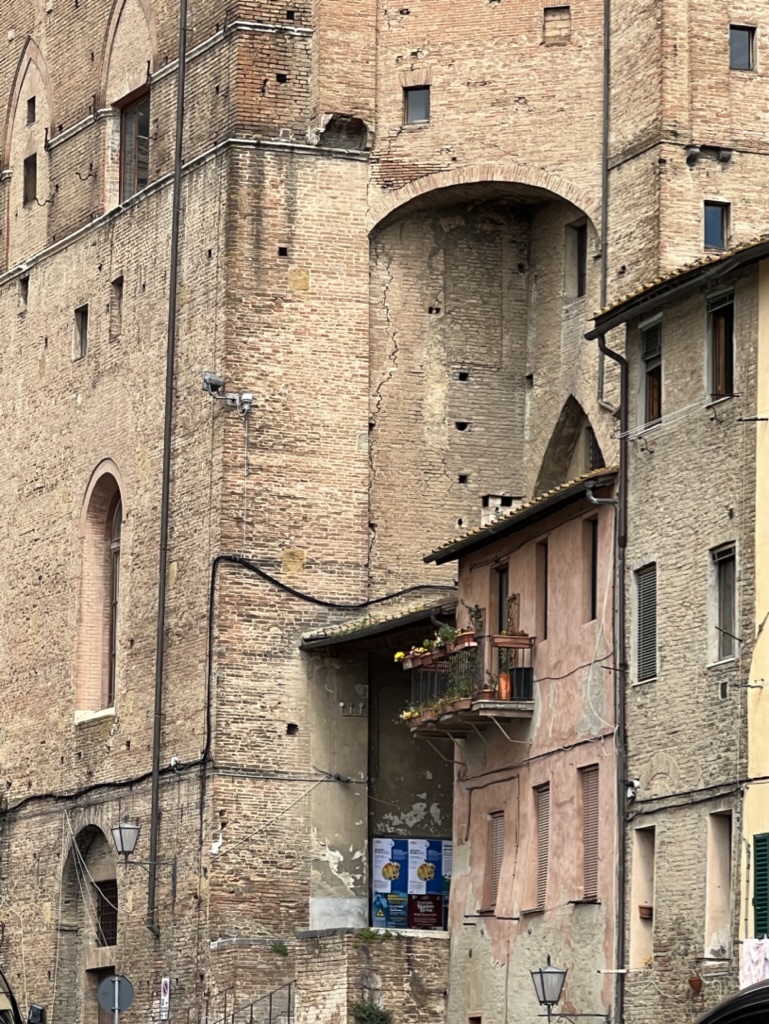 Today we walked and walked, starting from the hotel to the Duomo, which while inundated with tourists (indeed this is the first place we’ve really encountered lots of tourists) is as I remembered it. The Duomo took 175 years to build, and they built it from back to front (so that mass could be held during construction). Frankly, I don’t remember having to deal with long lines to enter (which fortunately we were able to bypass because we bought tickets online prior to today) and I don’t remember as much chaos brought about by having so many people inside at one time. Anyway, we persevered and then just walked out past and through the wonderful Piazza del Campo––the main public space in the historic center of Siena—one of Europe’s greatest medieval squares. In the 13th Century, there used to be a marketplace on this site. Today, the public space was filled with people of all ages—kids running around, school children visiting with their classes (and teachers trying to explain the significance of the space—as the kids were on cell phones and also playing cards), adults drinking wine and cappuccinos at the cafes that surround the space, and tourists taking selfies.