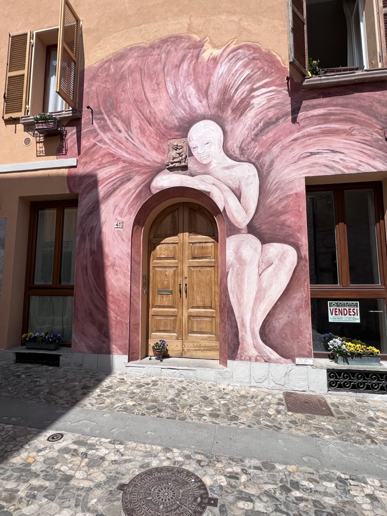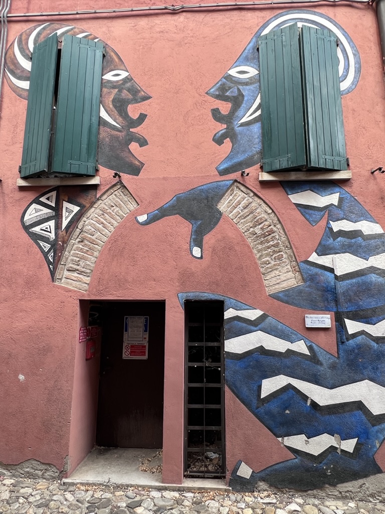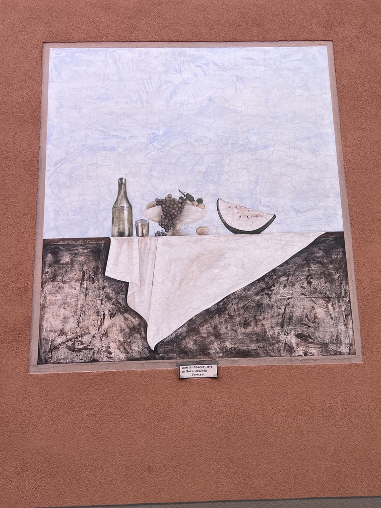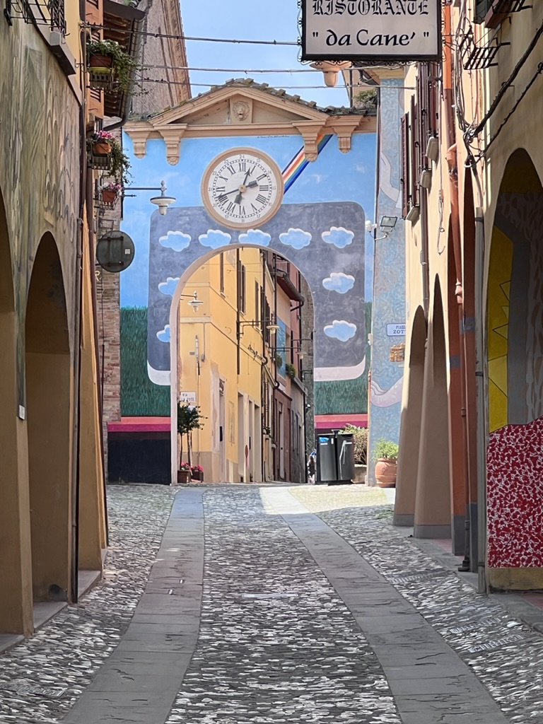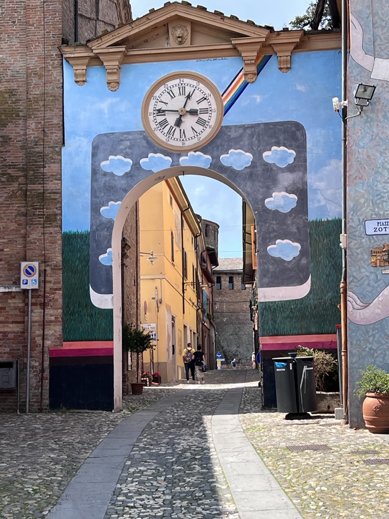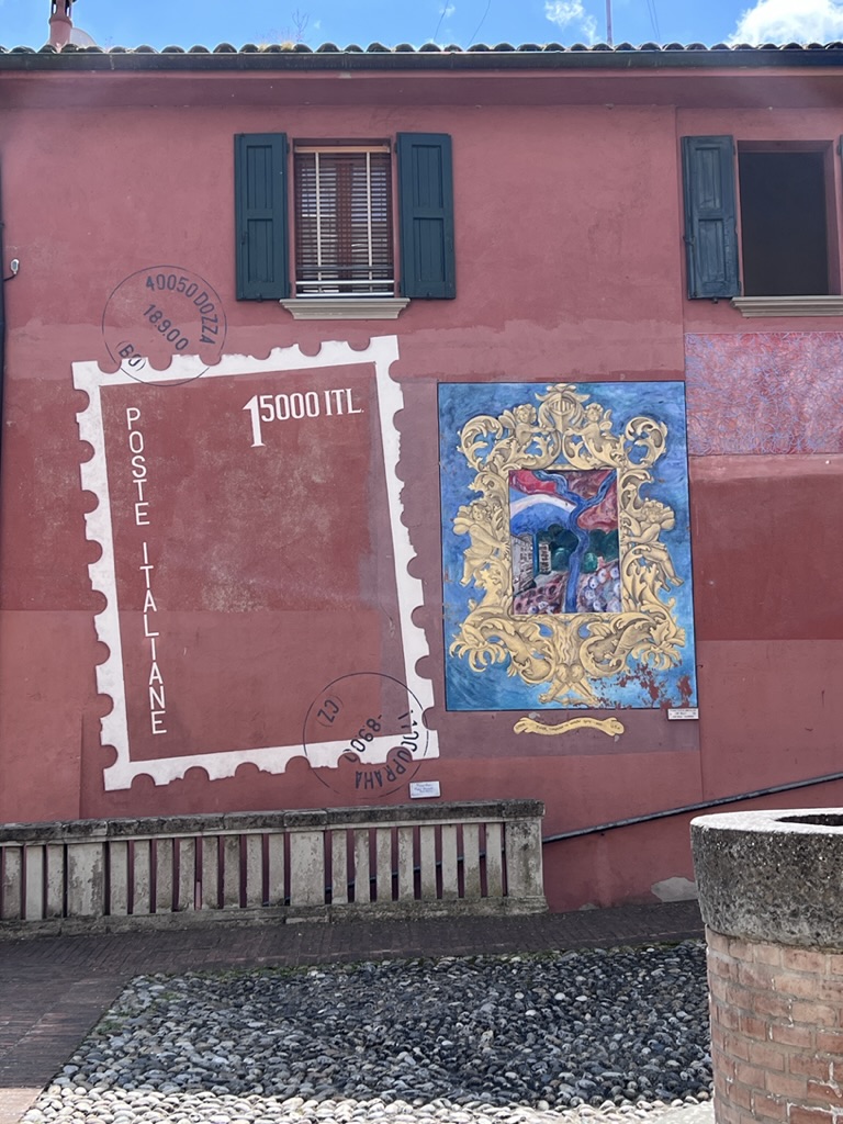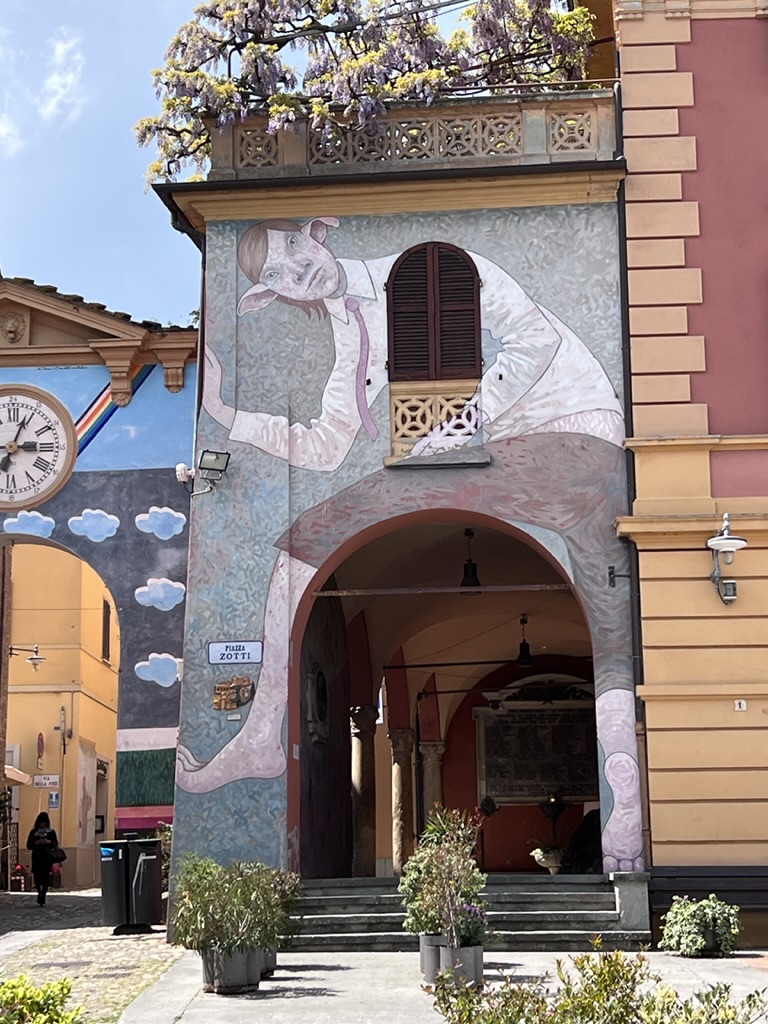 We arrived in Dozza around 12:30 and began walking through the very picturesque little village that some years ago (I assume in an effort to build its economy through tourism?) began a biannual festival of painted walls, when famous national and international artists paint permanent works on the walls of the houses and commercial buildings. I’d say there is a wide variety of skill and talent but it’s a delightful walk and the cutest town ever. Stopped for a quick (well nothing is really quick about eating in Italy) lunch and as we left the restaurant it began to rain. We headed to the car and as we left little Dozza, we realized that on the outskirts of town there were more murals… and we had not had our fill of gelato for the day. So we stopped at a bar/gelateria and walked around to see these other murals. When we went for the gelato, we realized this place was a real mix of “services”— full gelateria with about 25 flavors, a full bar, sandwiches, and in the back room, slot machines!